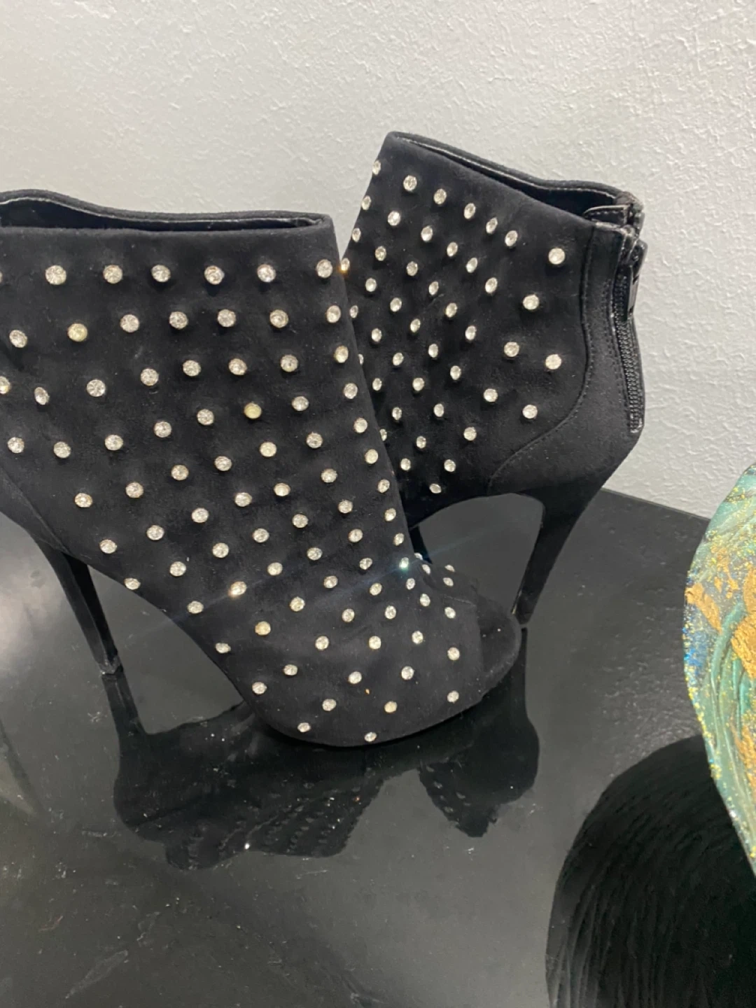 Black Suede Rhinestone Studded Peep-Toe Ankle Boots