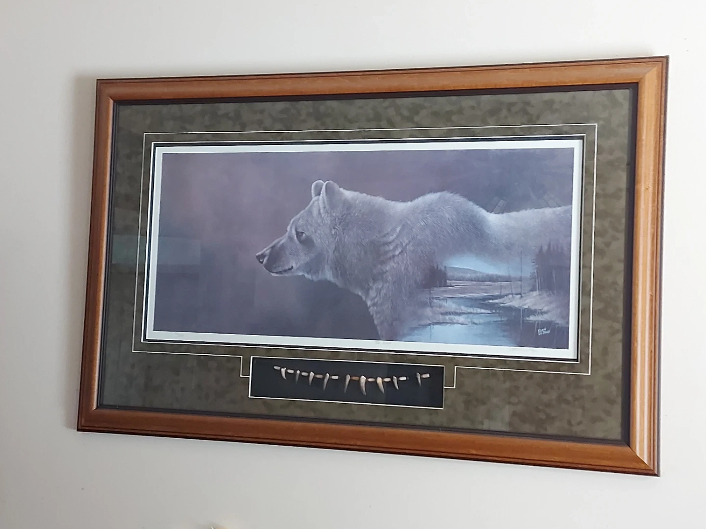 This framed art piece features a grizzly bear blended with a wilderness scene by Eddie LePage It includes a display of Bear claw necklace. The wooden frame measures 25 inches wide by 15 inches tall.