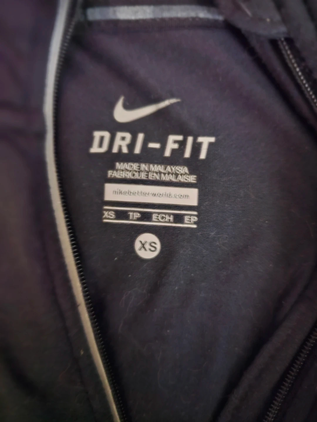 This is a Nike Dri-FIT long-sleeve shirt. It's a size XS and made in Malaysia. The material wicks moisture for comfort during activity.