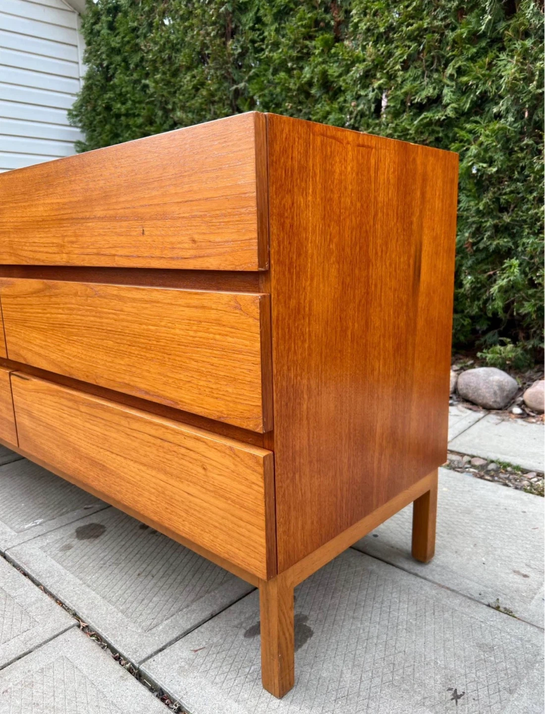 Selling a Mid Century Teak 6 drawer teak dresser with a rich, warm grain and clean Scandinavian design. Features sleek handle free drawers with integrated pulls, smooth glide. Timeless, minimalist look in excellent vintage condition with minor wear.