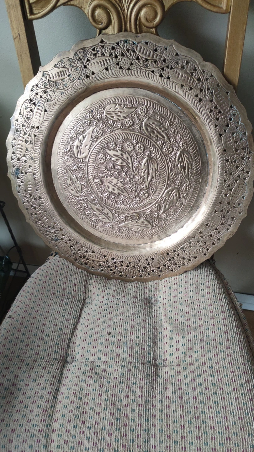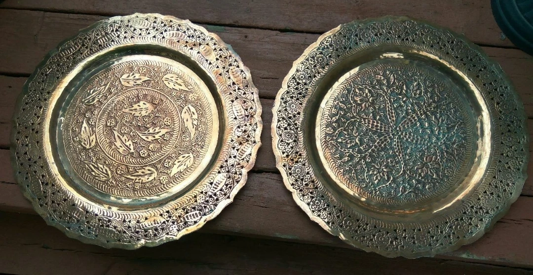 Two ornate brass plates. Intricate floral designs. Beautiful detail. Decorative accents. Perfect for a unique home decor.