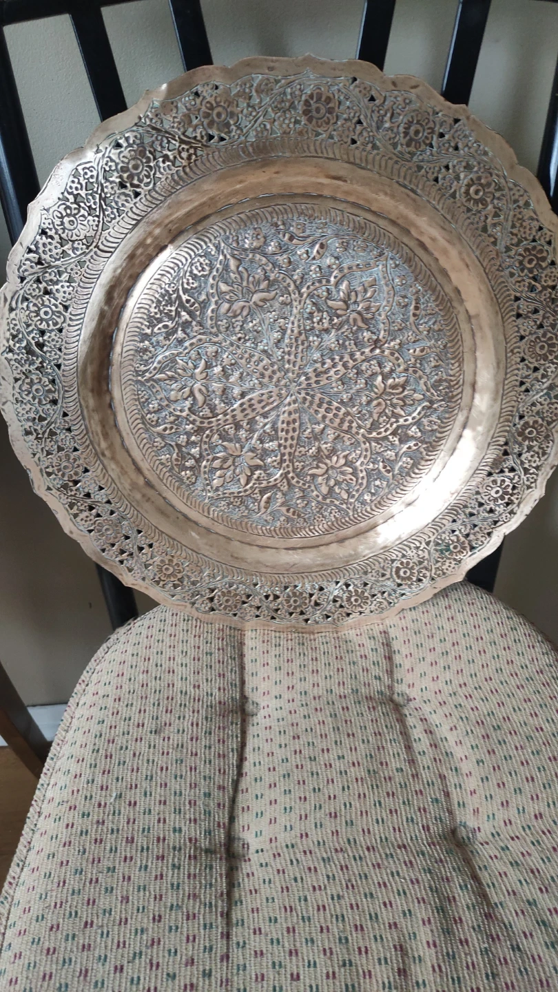 Two ornate brass plates. Intricate floral designs. Beautiful detail. Decorative accents. Perfect for a unique home decor.