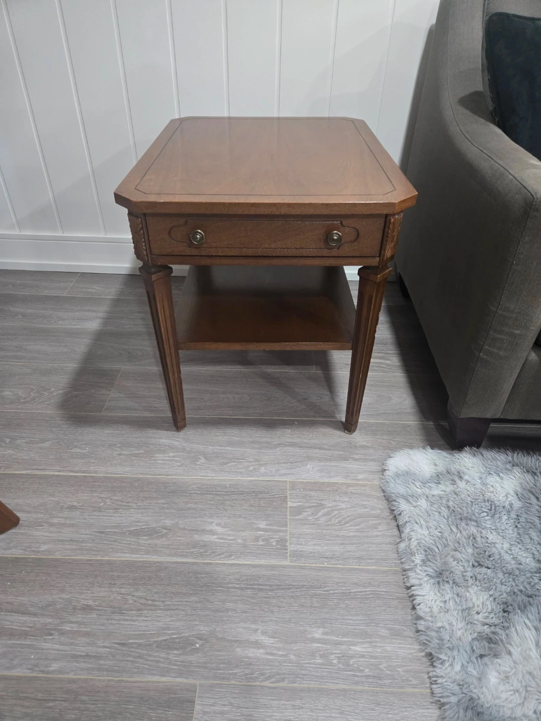 This is a vintage wood end table with a single drawer. It features a lower shelf for extra storage. The wood has a classic finish and decorative carvings on the legs.