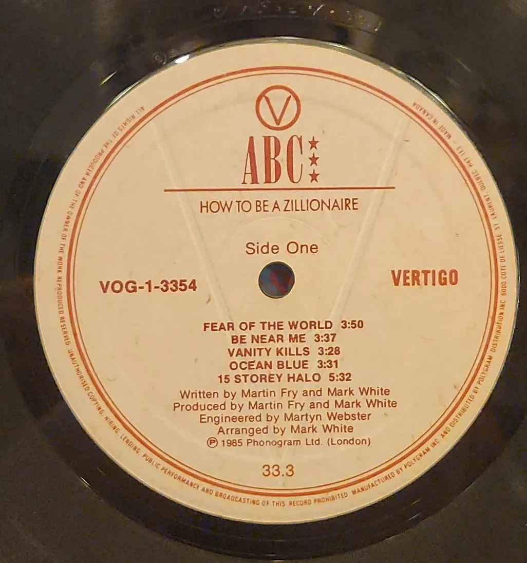This is the ABC album "How To Be A Zillionaire" on vinyl. It was released in 1985. Side One includes tracks like 'Fear Of The World' and 'Be Near Me'. NO SKIPS! Album cover not shown because camera showed it as a Board Game. Cover in excellent condition. MINOR SCUFFS SIDE 2