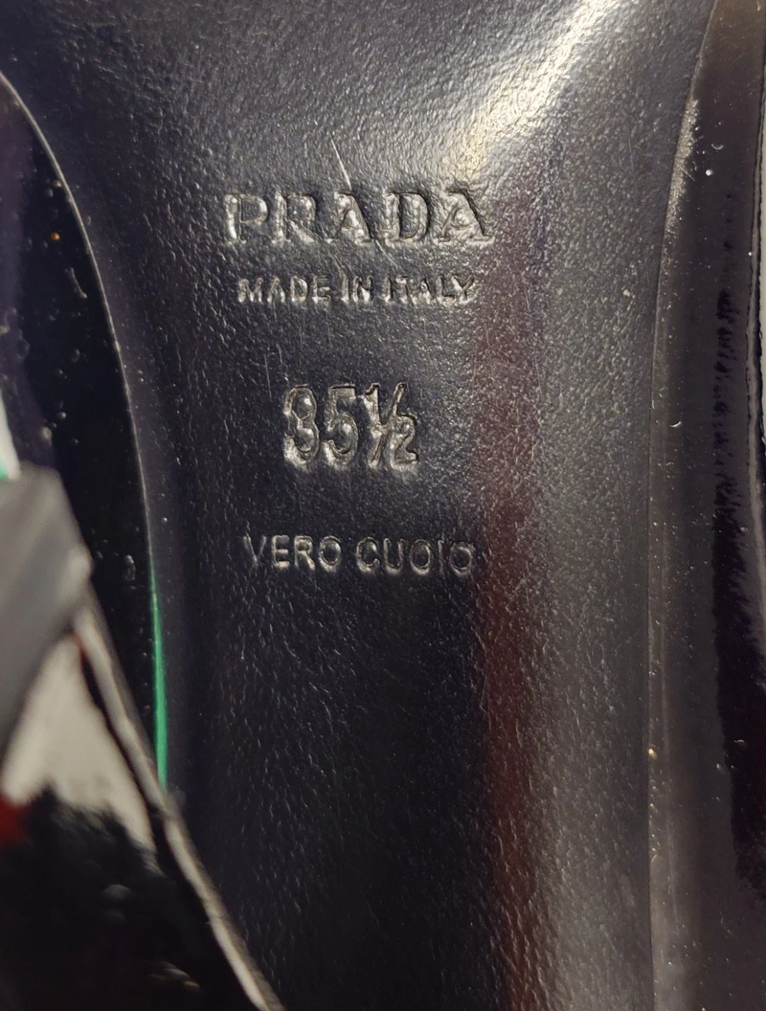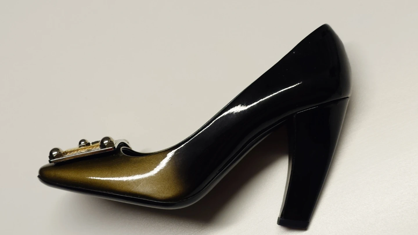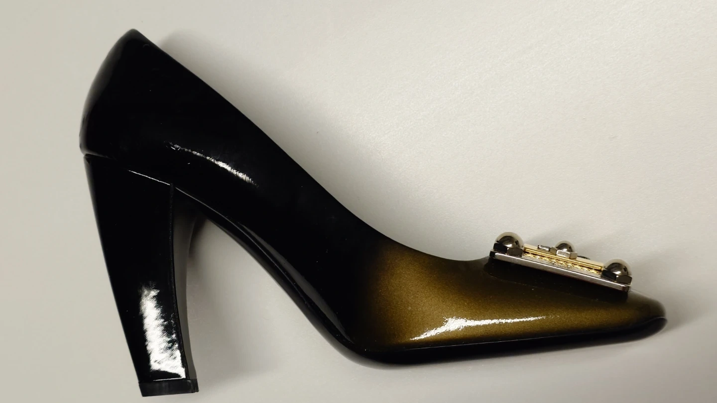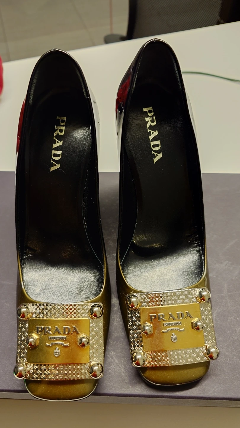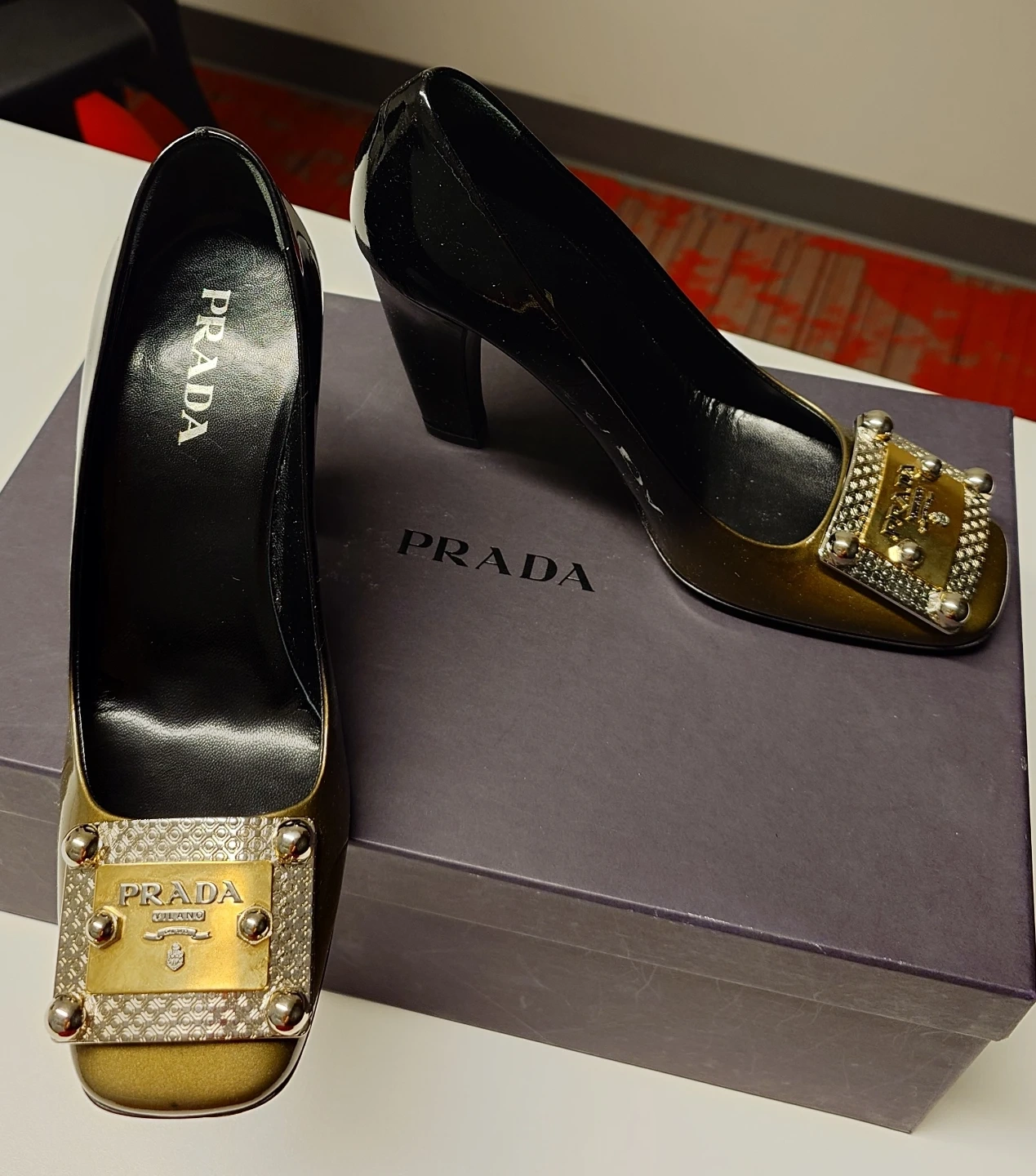 These Prada heels boast a glossy black and gold patent leather finish. They feature a decorative buckle with "Prada Milano" detailing on the toe. The block heel offers a stylish lift.