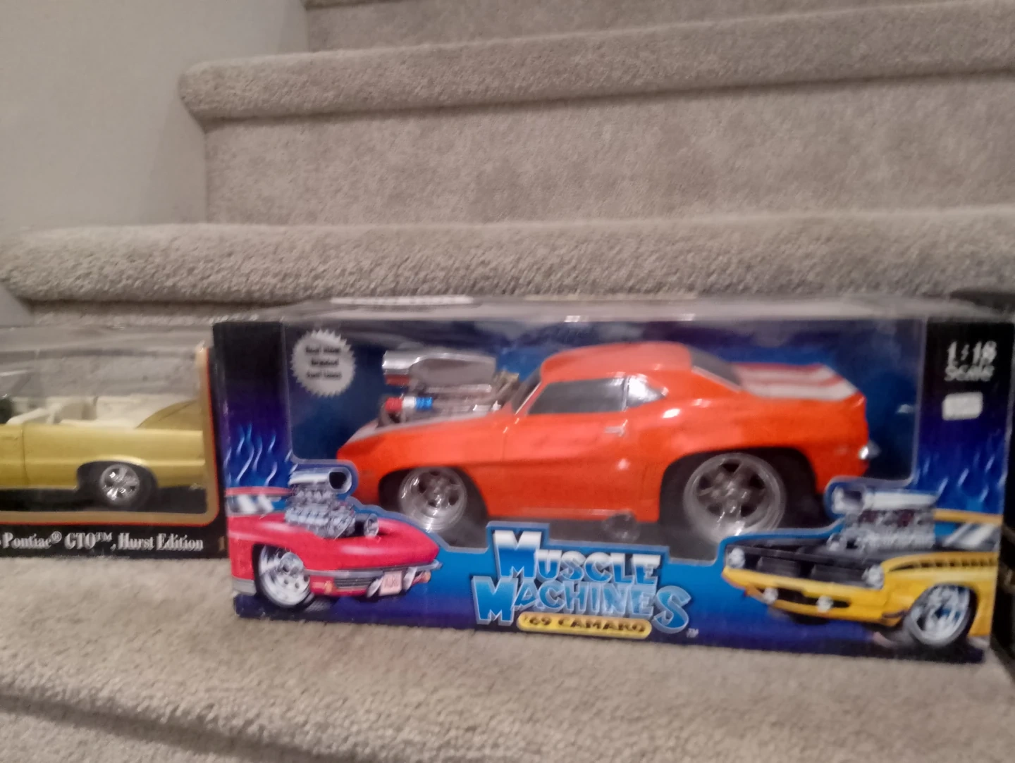 This is a 1:18 scale die-cast model of a '69 Camaro from Muscle Machines. It's an orange muscle car with custom detailing. Includes original packaging.