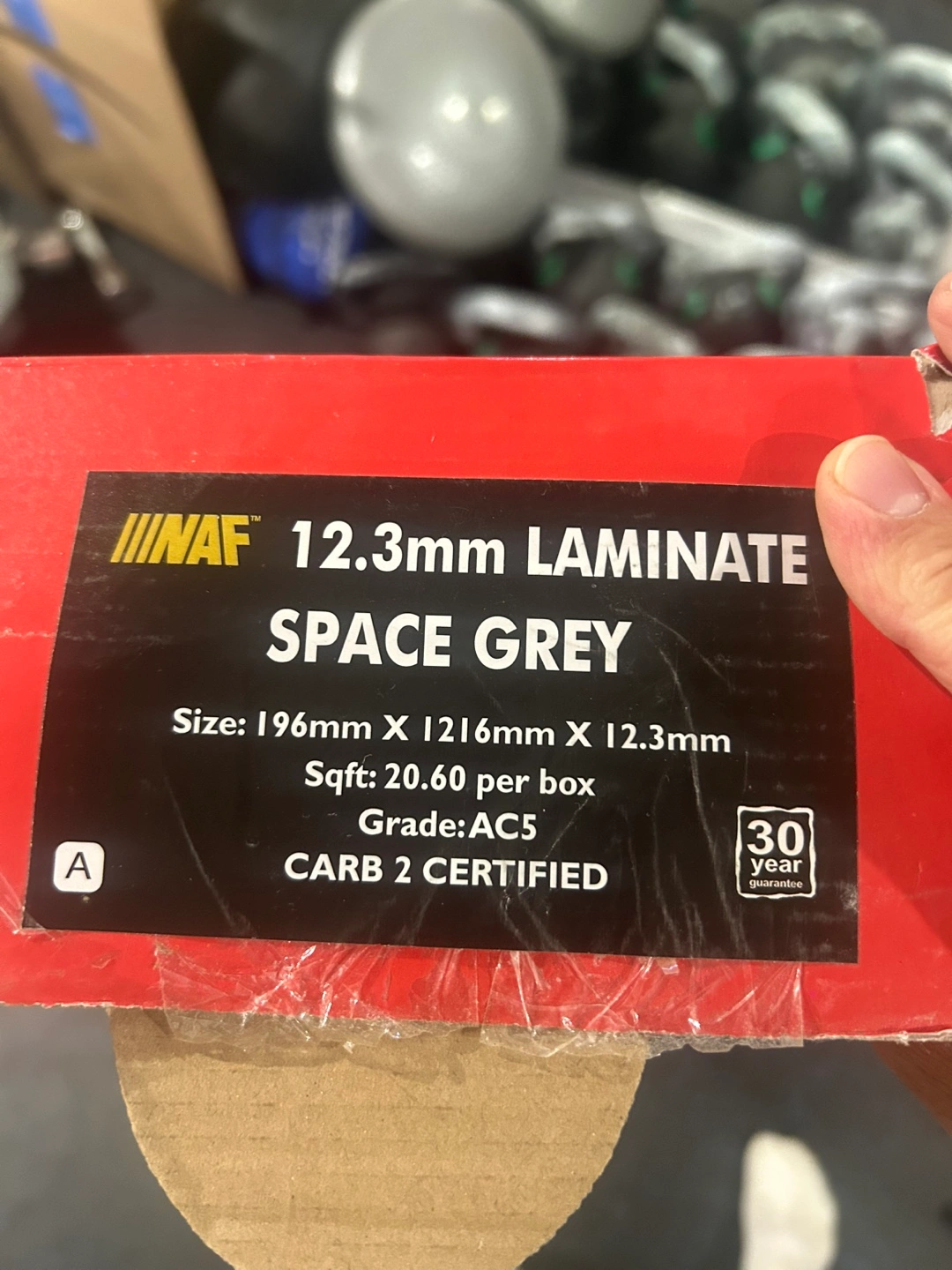 Selling INAF 12.3mm laminate flooring in Space Grey. 5 full boxes and 1 partial box available.