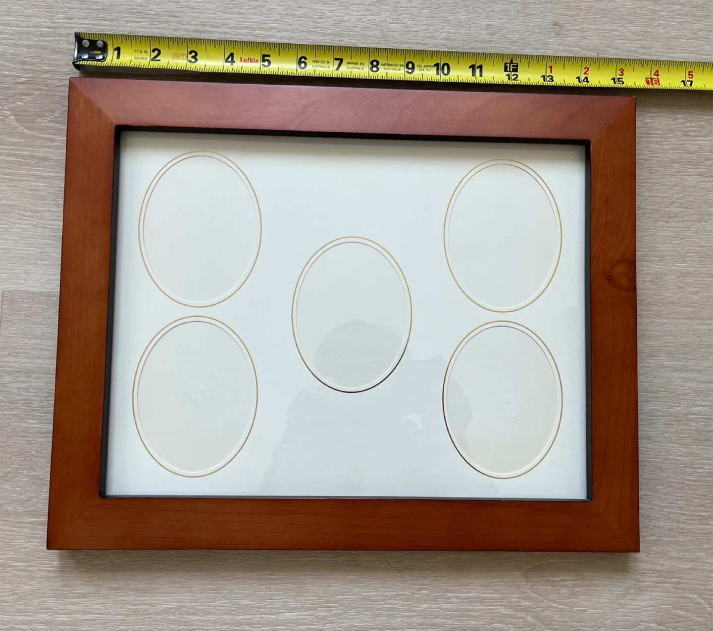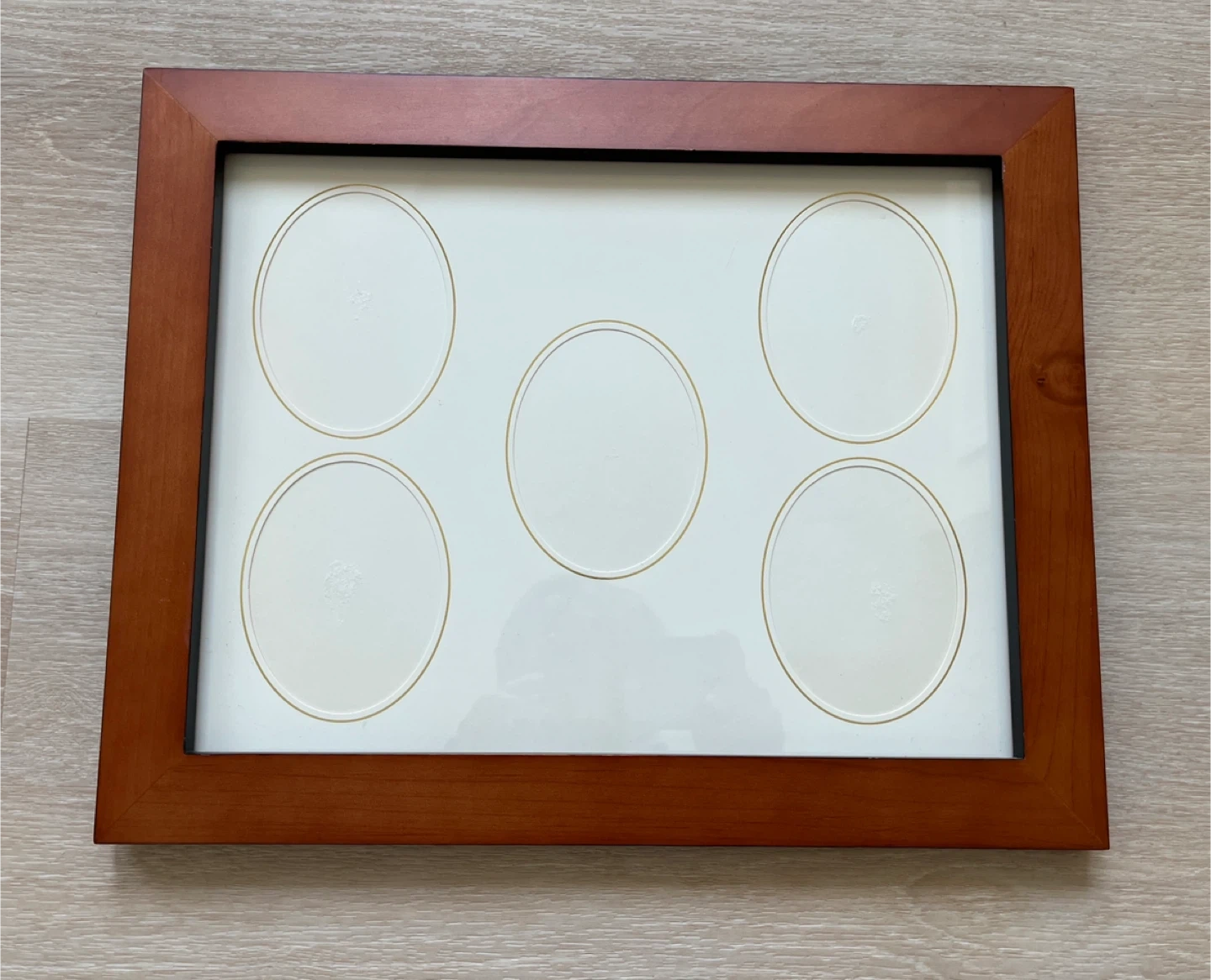 A wood collage frame designed to hold five oval photos. The frame has a cherry wood finish and a white matting.The frame can be used horizontal or vertically, whichever suits your pictures best.