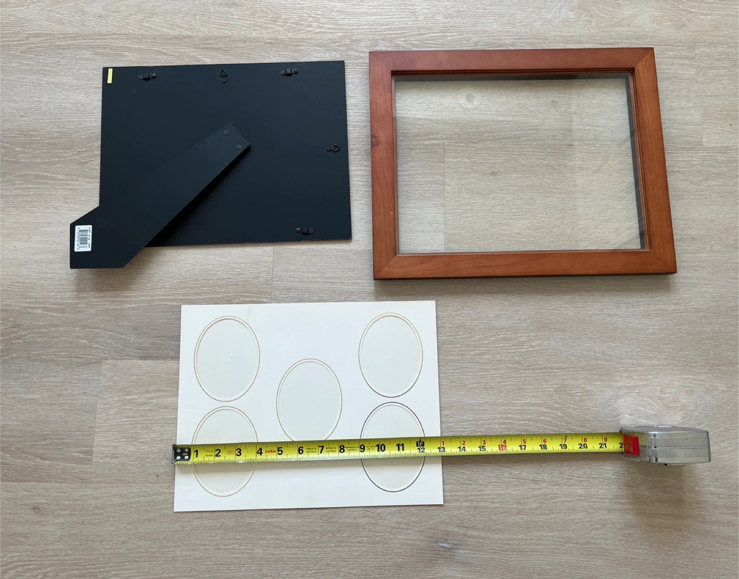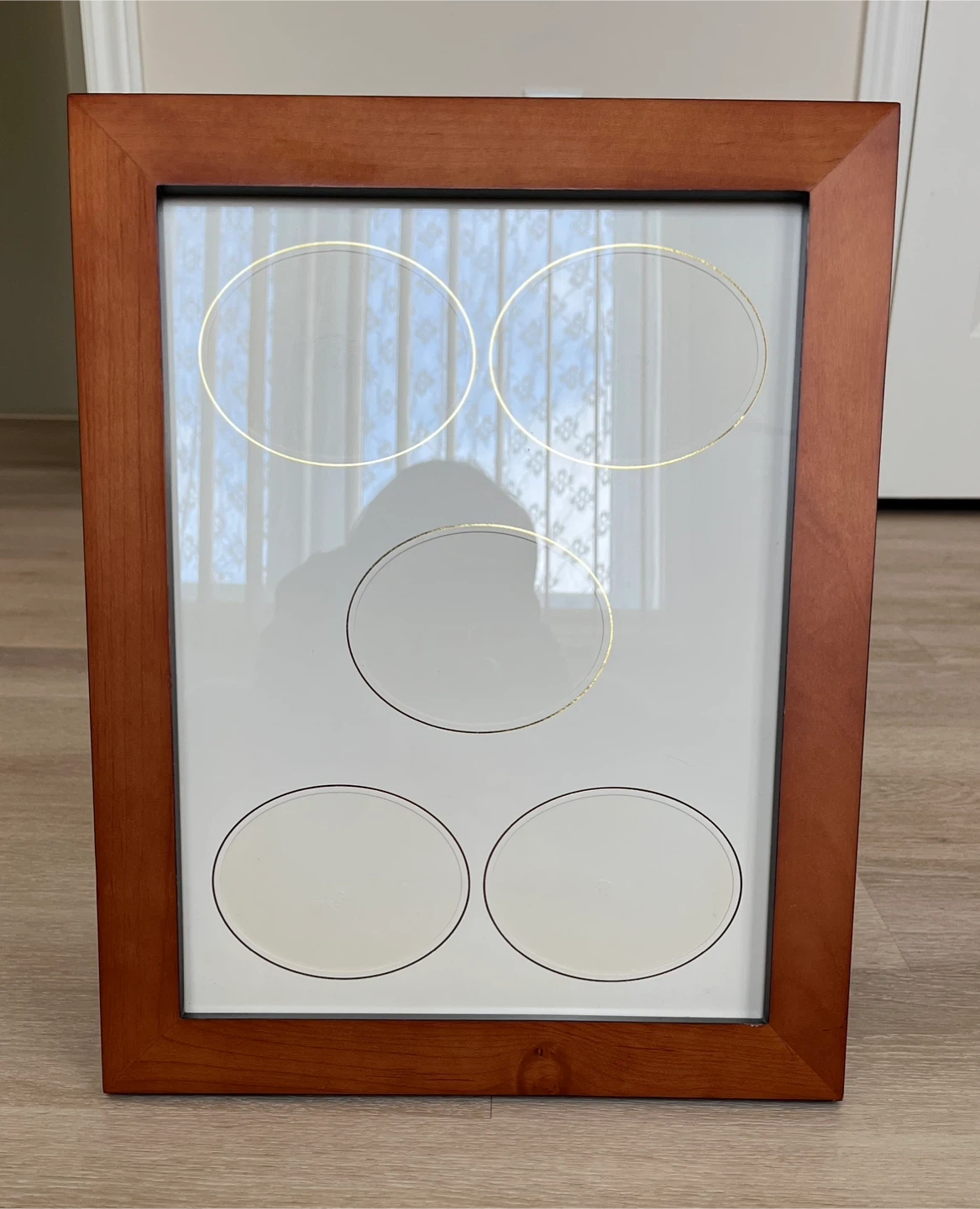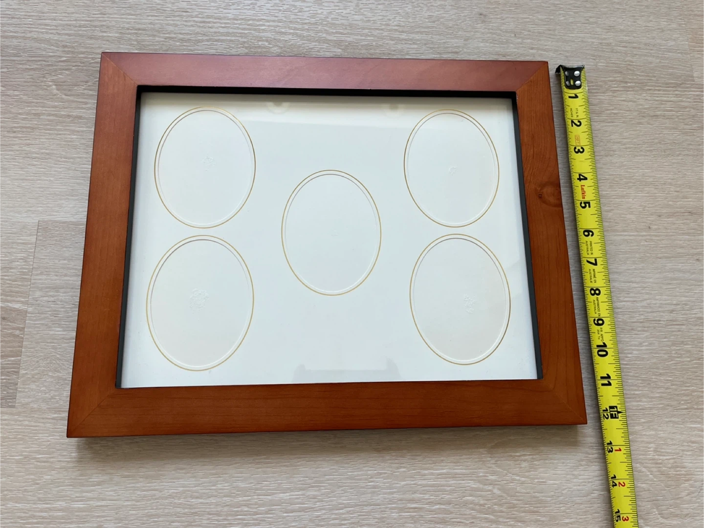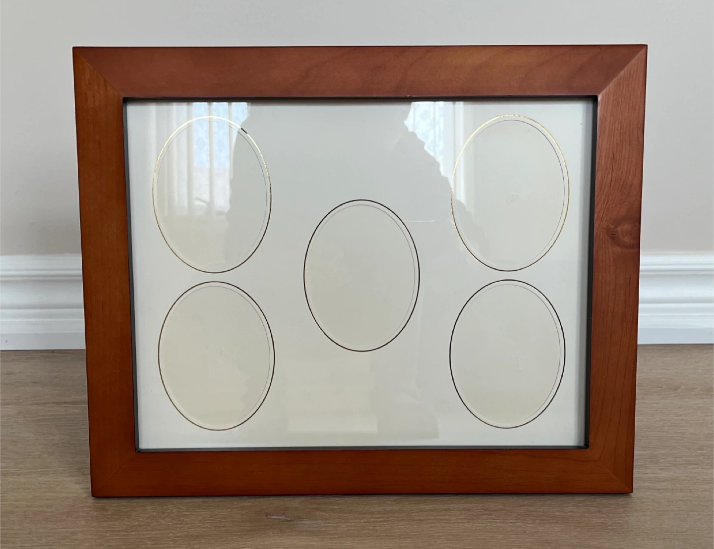 A wood collage frame designed to hold five oval photos. The frame has a cherry wood finish and a white matting.The frame can be used horizontal or vertically, whichever suits your pictures best.