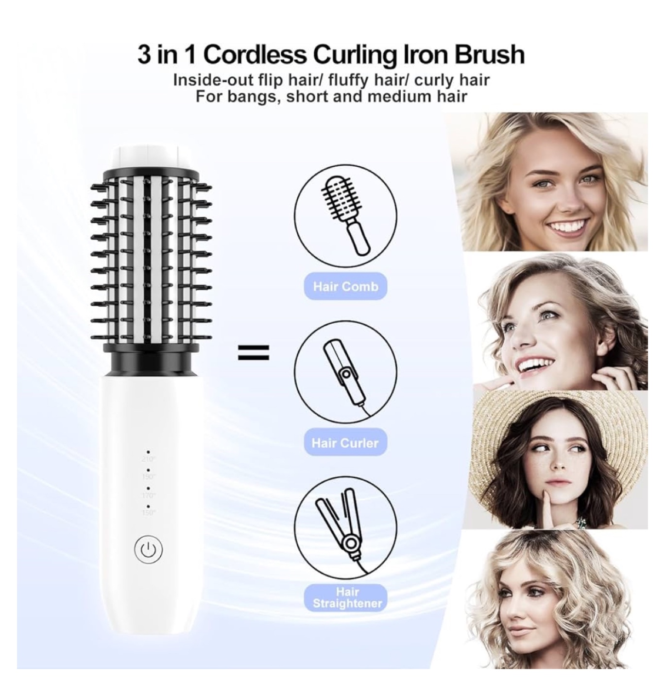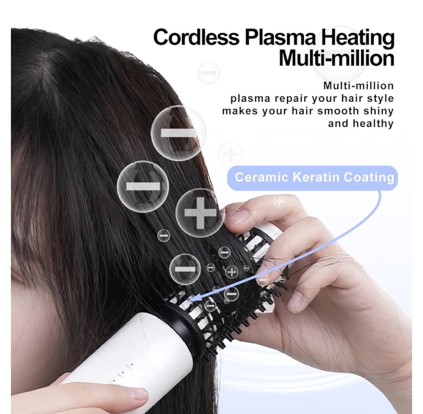 3-in-1 cordless curling iron brush. Features ceramic keratin coating. Multi-million plasma repair. Heats larger areas faster. Portable and lightweight.