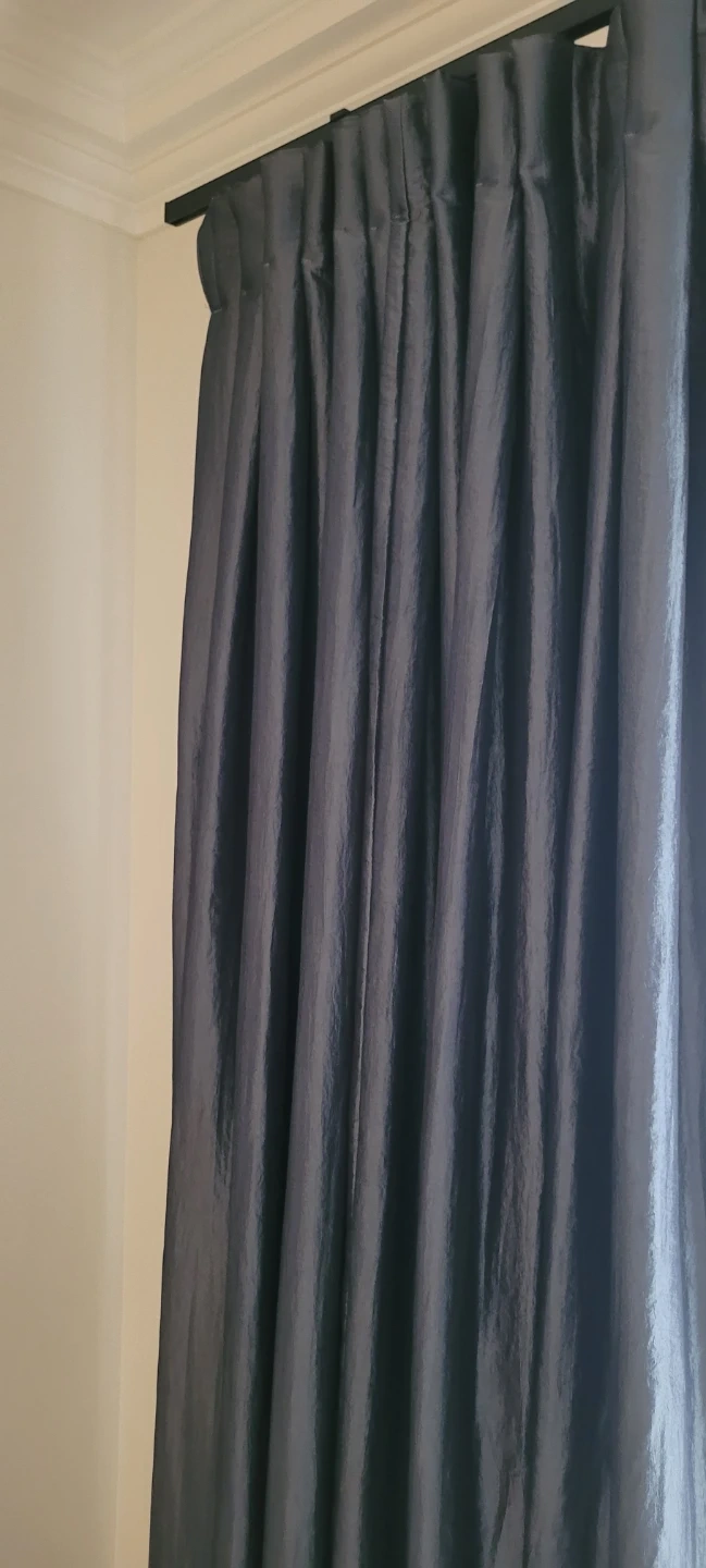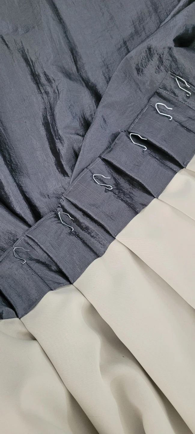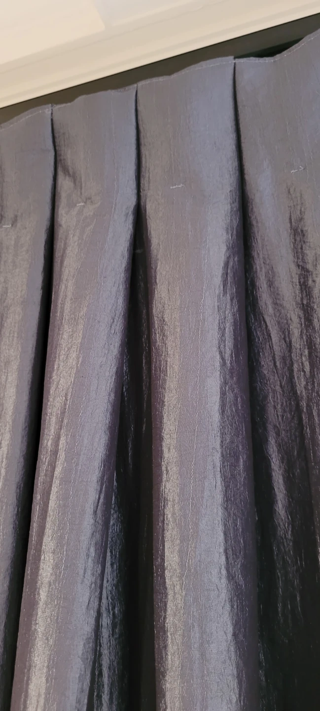 These custom made pleated curtains feature a slightly shimmering fabric. They come with hooks attached for easy hanging. A stylish way to update any room's look! Drapery panels x 2 with blackout lining. Inverted pleat top with hooks.