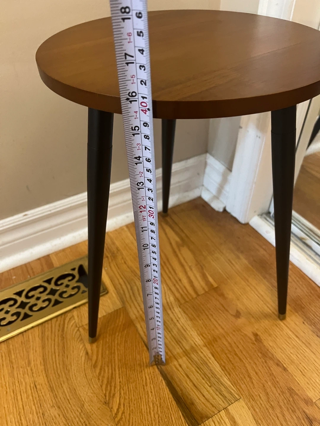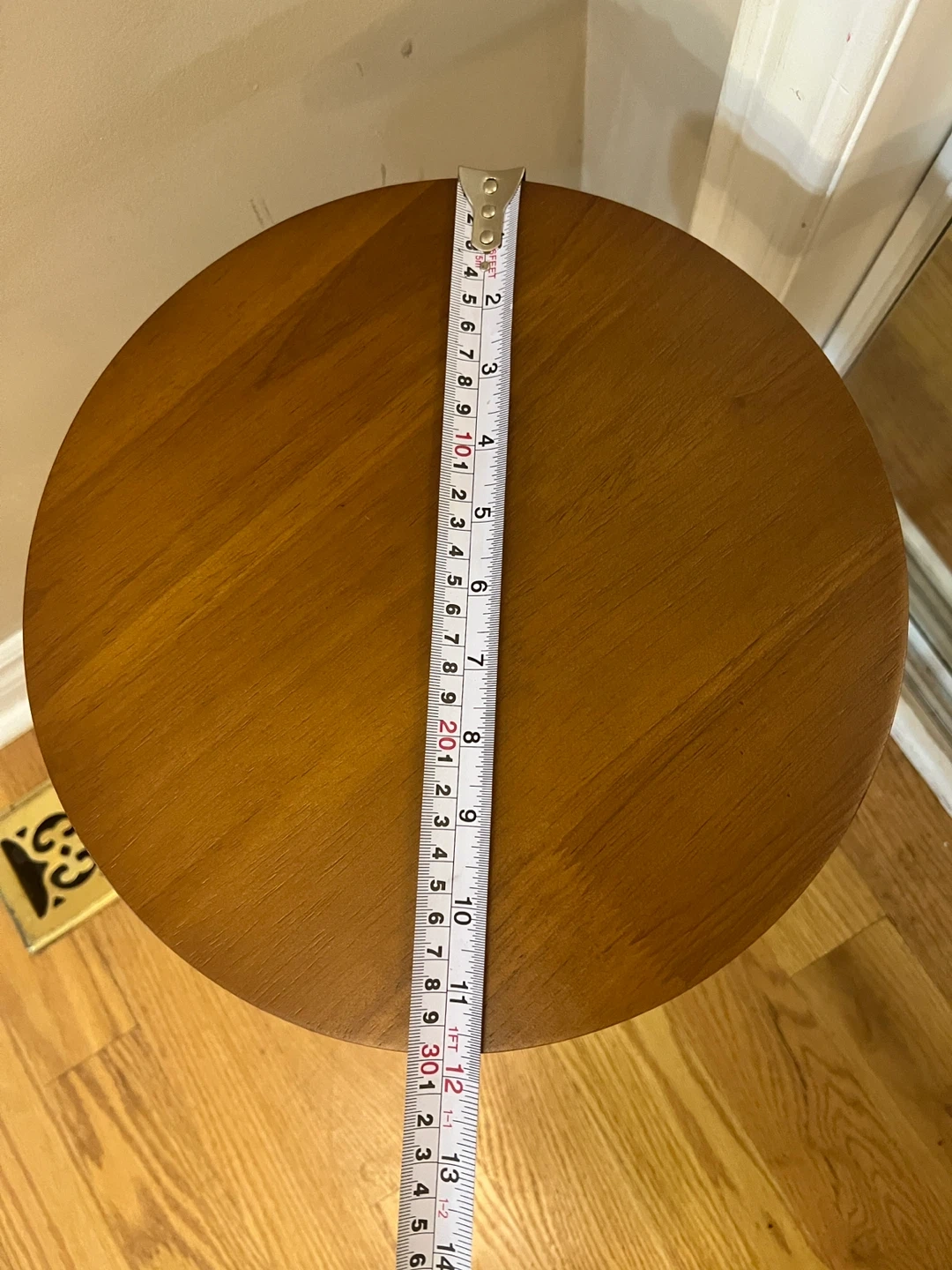 The table stands about 16inches tall and the top is around 12 inches in diameter