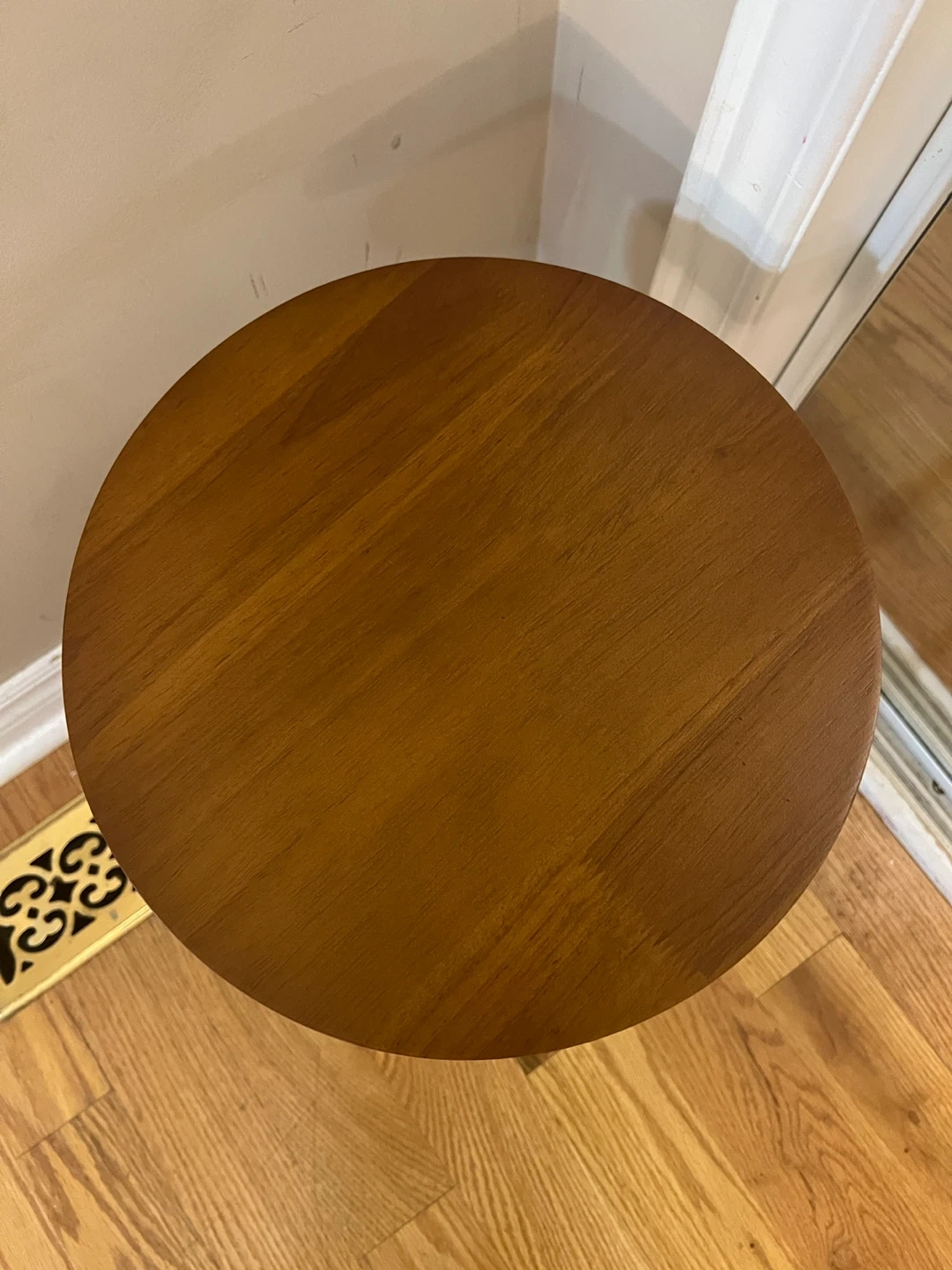 A cute little plant stand / table for flower pots with a round, wooden top and black legs. It's perfect for displaying plants or as a convenient surface next to a chair.