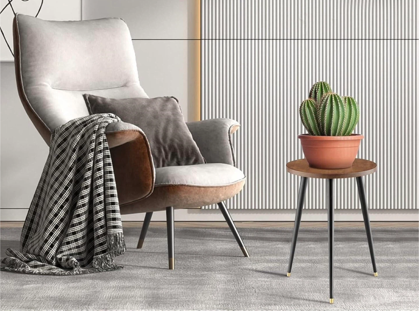 A cute little plant stand / table for flower pots with a round, wooden top and black legs. It's perfect for displaying plants or as a convenient surface next to a chair.