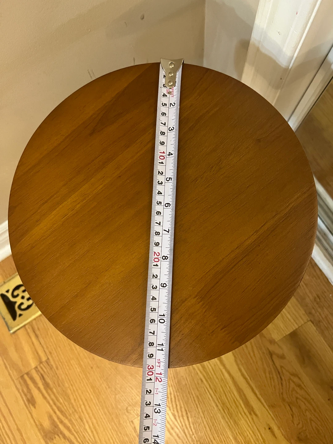 The table stands about 16inches tall and the top is around 12 inches in diameter