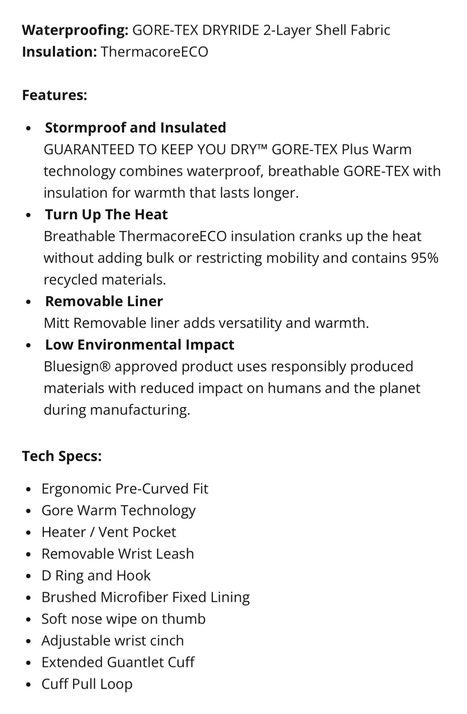 Keep your hands warm and dry on the slopes with these Burton Gore-Tex mittens! They're designed with Gore-Tex Dryride 2-Layer Shell Fabric and ThermacoreECO insulation to keep you cozy in stormproof conditions.