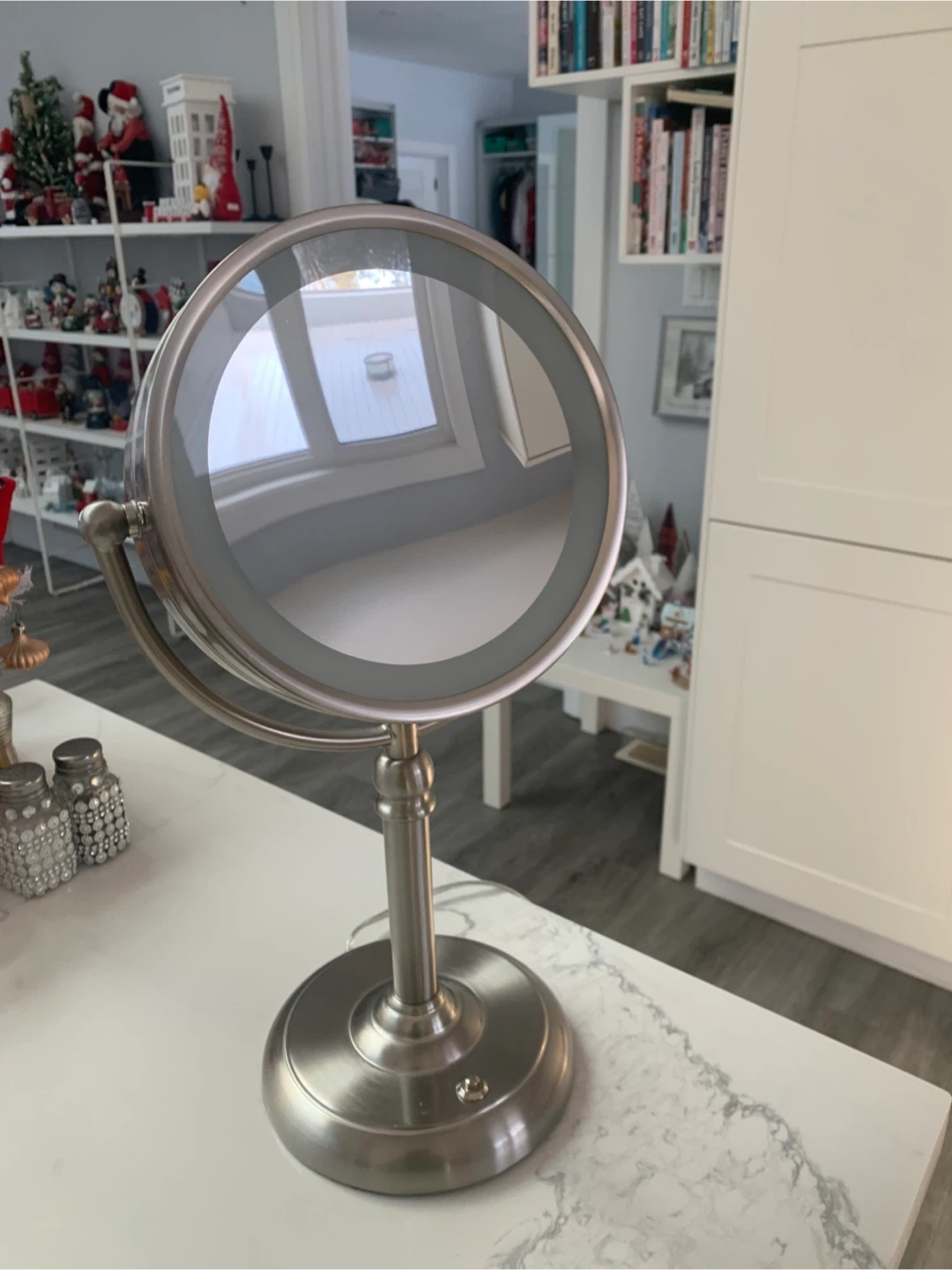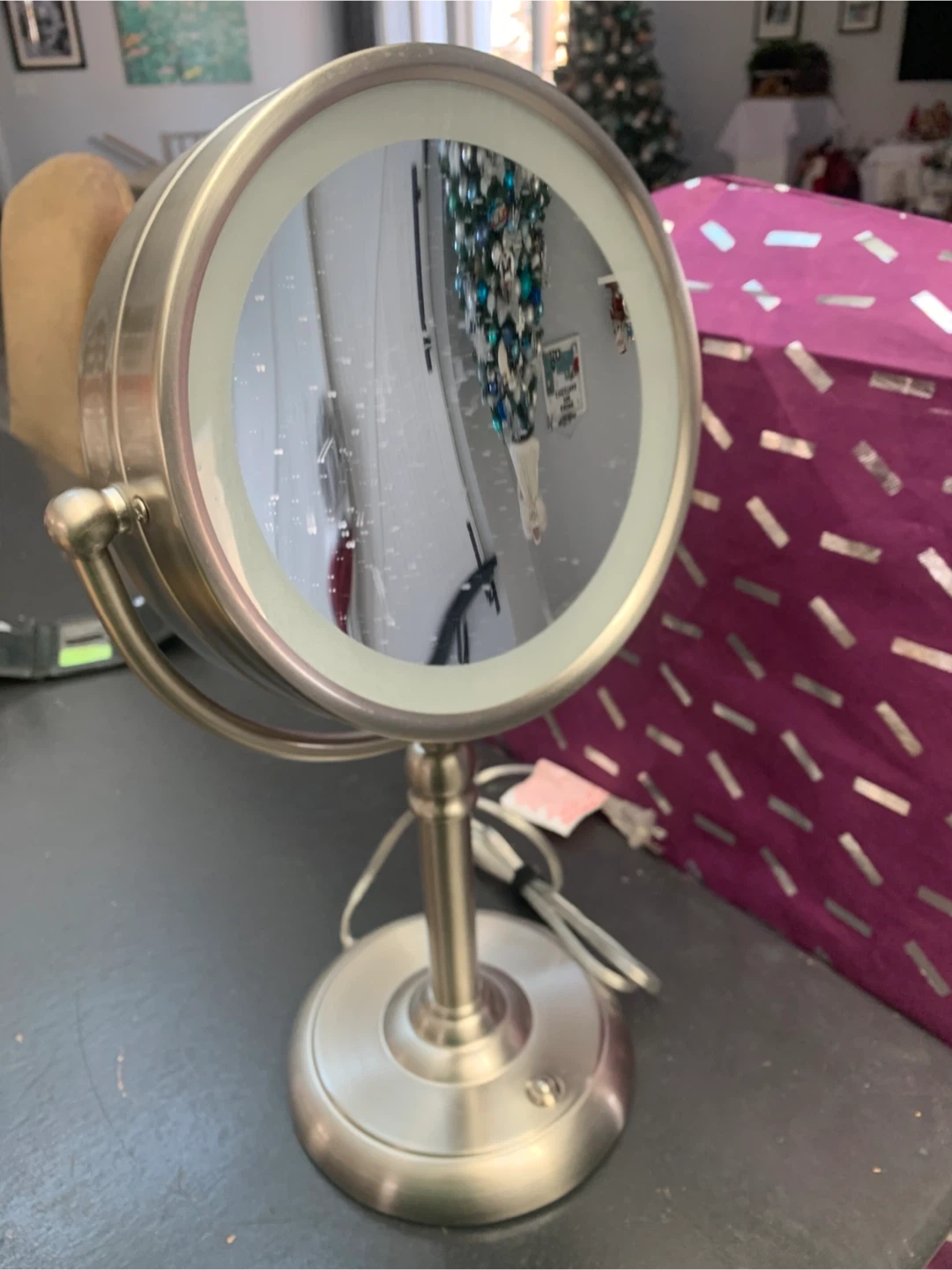 This is a tabletop makeup mirror with an LED light ring. It has a brushed silver finish and a dual-sided magnifying feature. The base is weighted for stability.