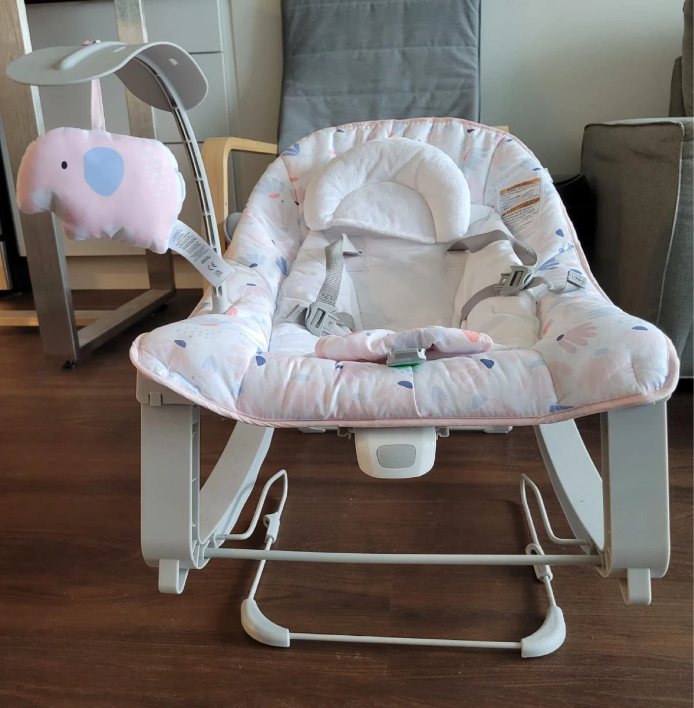 This infant rocker seat features a gentle rocking motion and a removable toy bar. It has a soft, padded seat and adjustable safety straps for your baby's comfort and security. It's great for soothing and entertaining your little one.