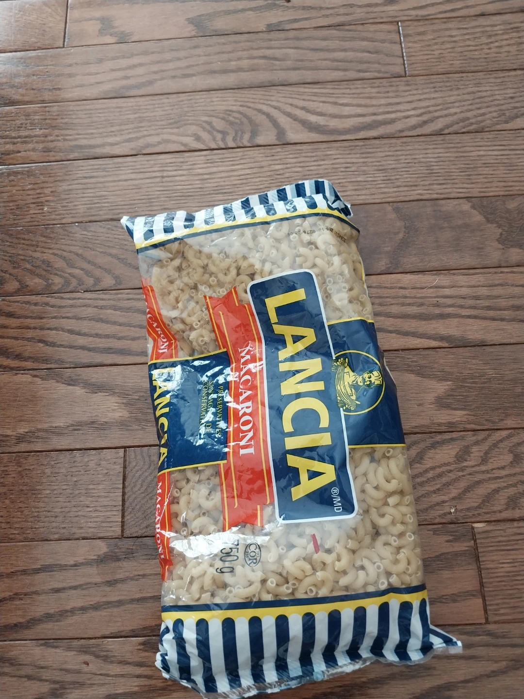 This is a 750g bag of Lancia Macaroni. It contains pasta. It's made without preservatives or artificial colours. This pasta is great for a quick weeknight dinner!