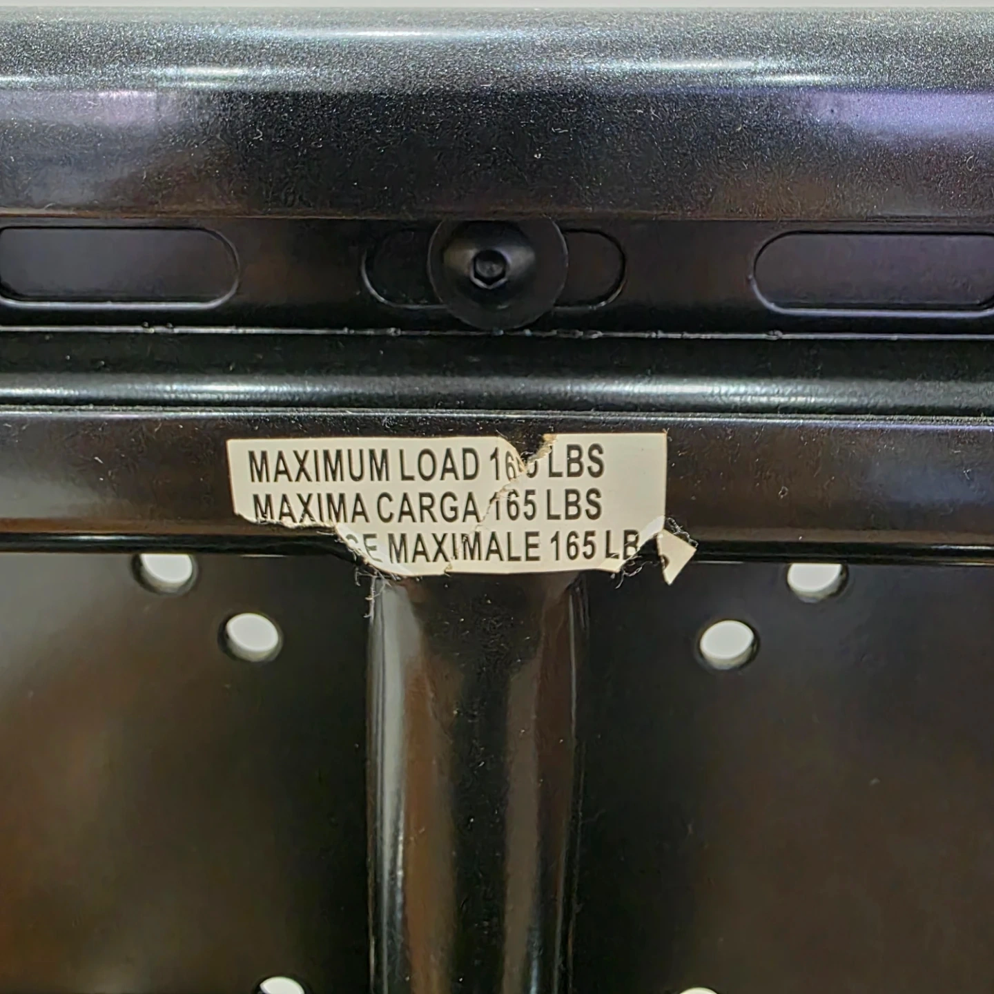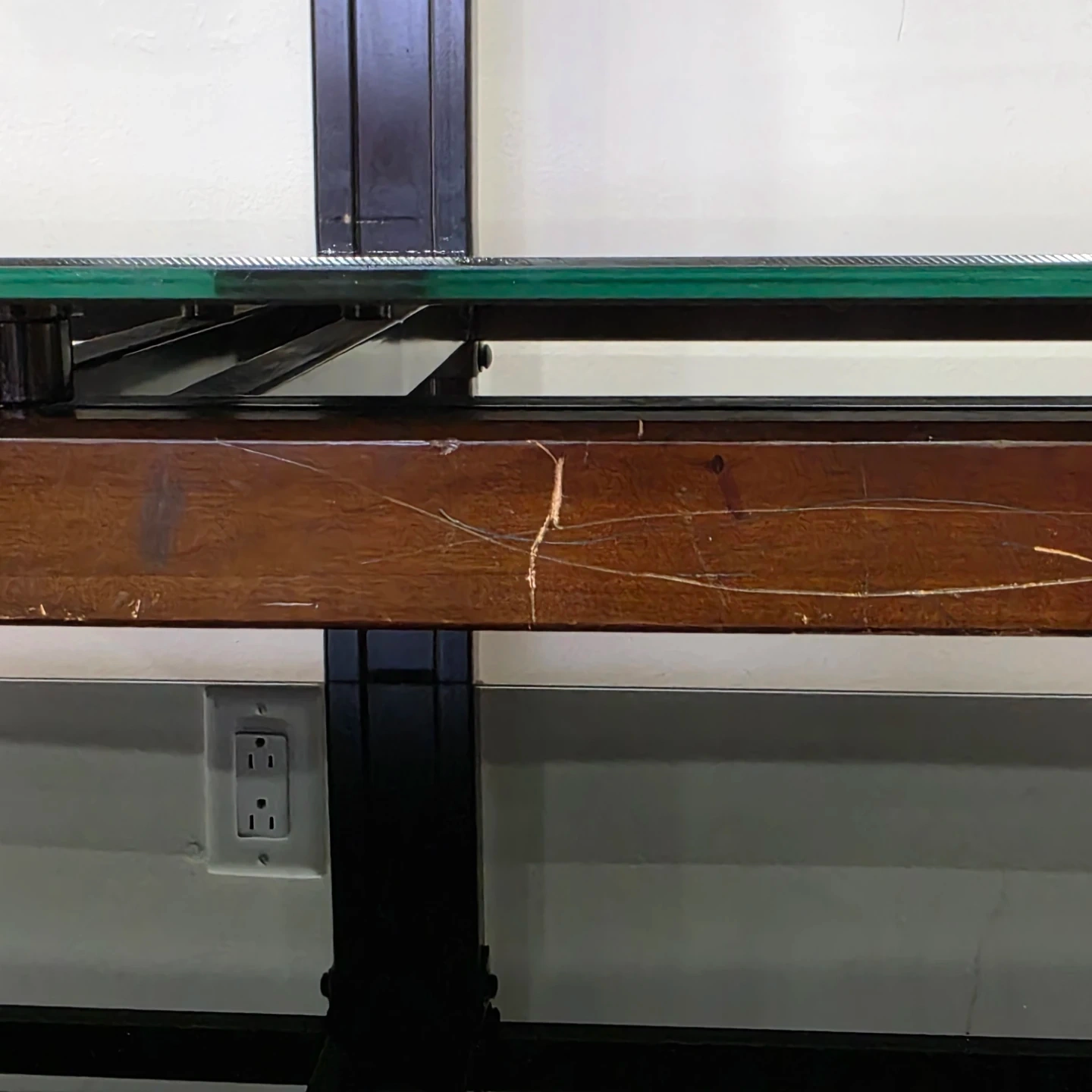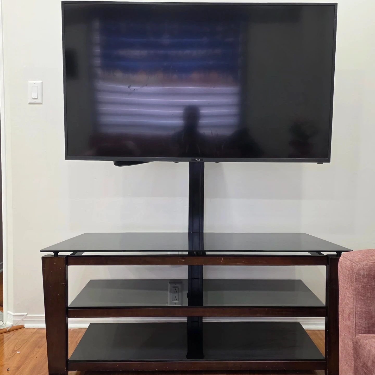 A dark wood and glass TV stand with multiple shelves and built in TV mount. It has a sturdy metal frame. Some minor scratches on the wood.