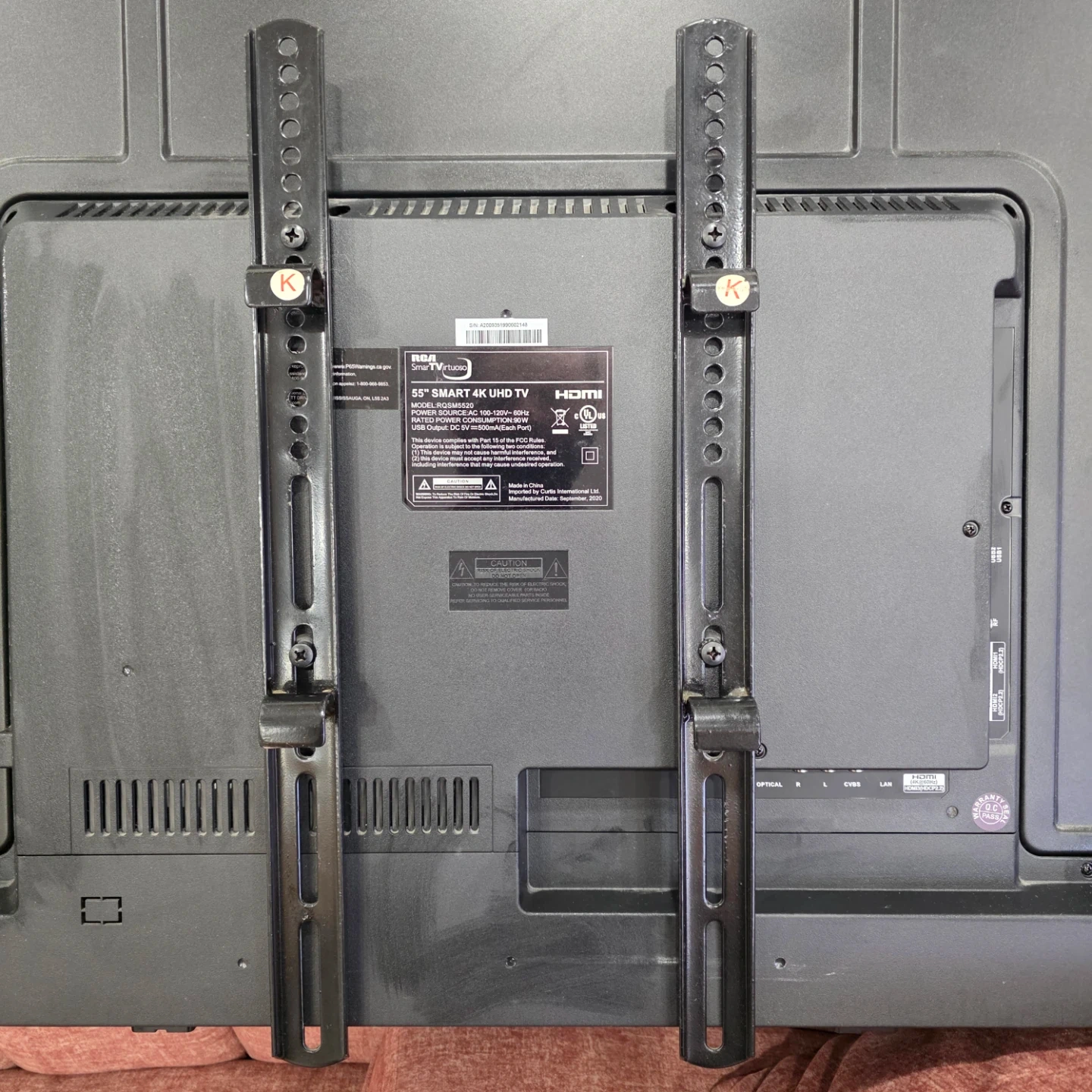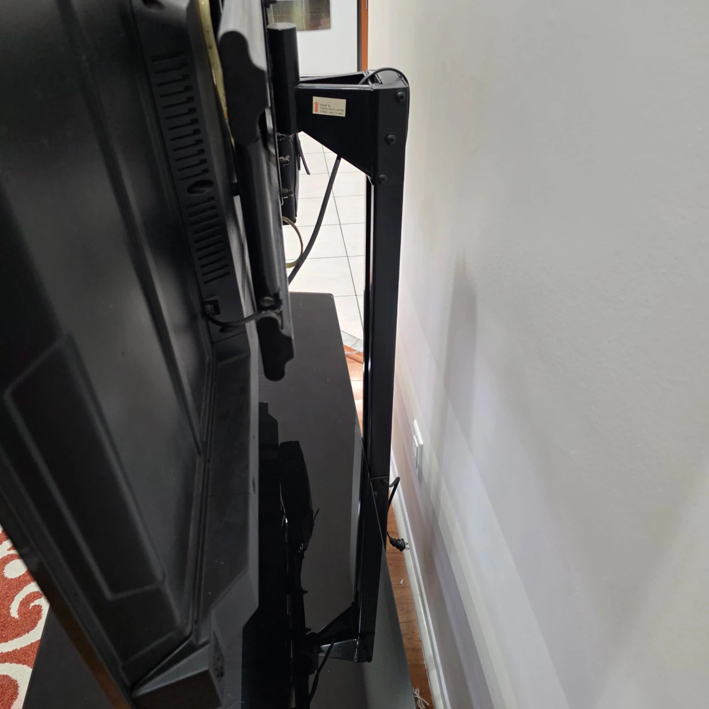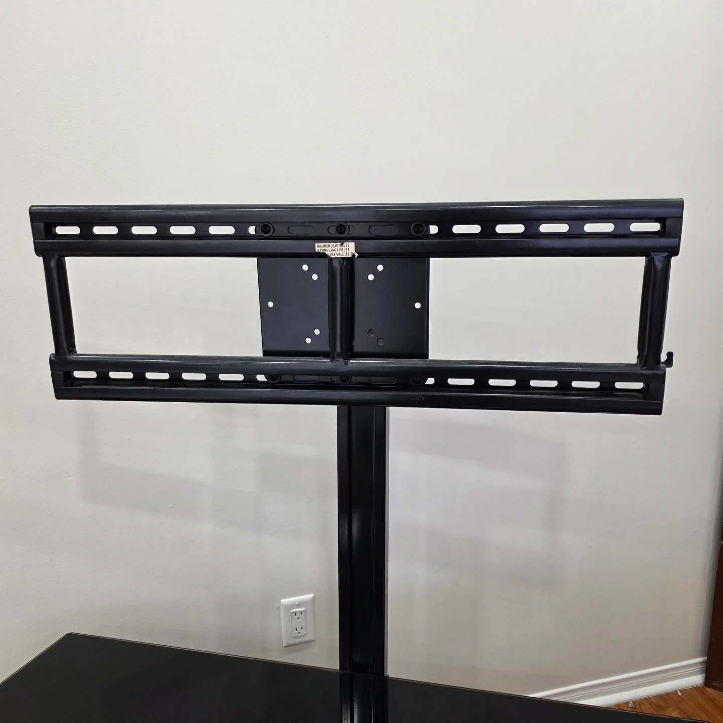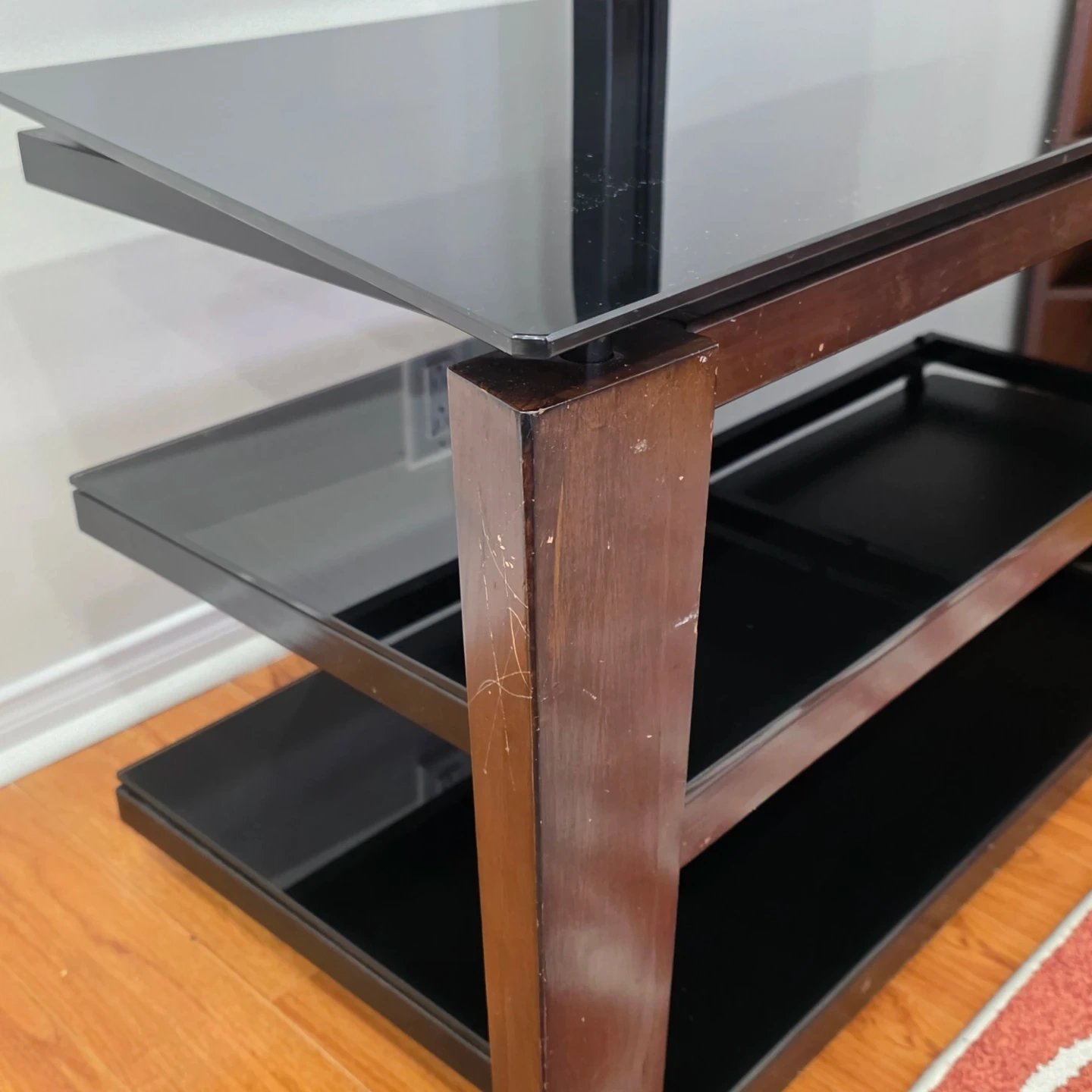 A dark wood and glass TV stand with multiple shelves and built in TV mount. It has a sturdy metal frame. Some minor scratches on the wood.