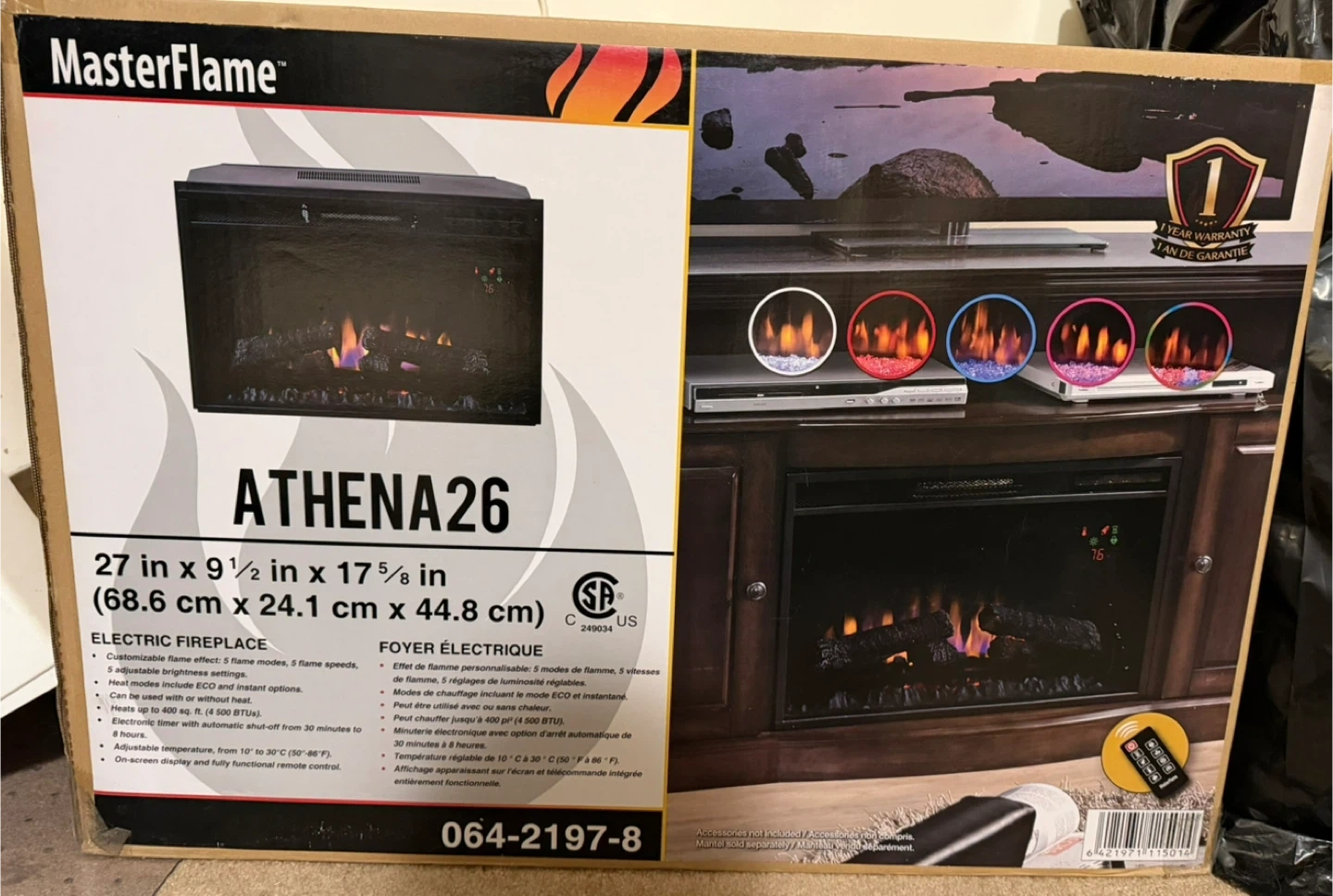 Selling a brand new MasterFlame Athena26 electric fireplace, still in its original packaging! It's 27 inches wide, 9 1/2 inches deep, and 17 5/8 inches high (68.6 cm x 24.1 cm x 44.8 cm). This electric fireplace has a customizable flame effect with 5 flame modes and 5 flame speeds. It can be used with or without heat and heats up to 400 sq ft (4 000 BTUs). It also has an electronic timer with automatic shut-off from 30 minutes to 8 hours, and an adjustable temperature from 10° to 30°C (50° to 86°F). It comes with a fully functional remote control