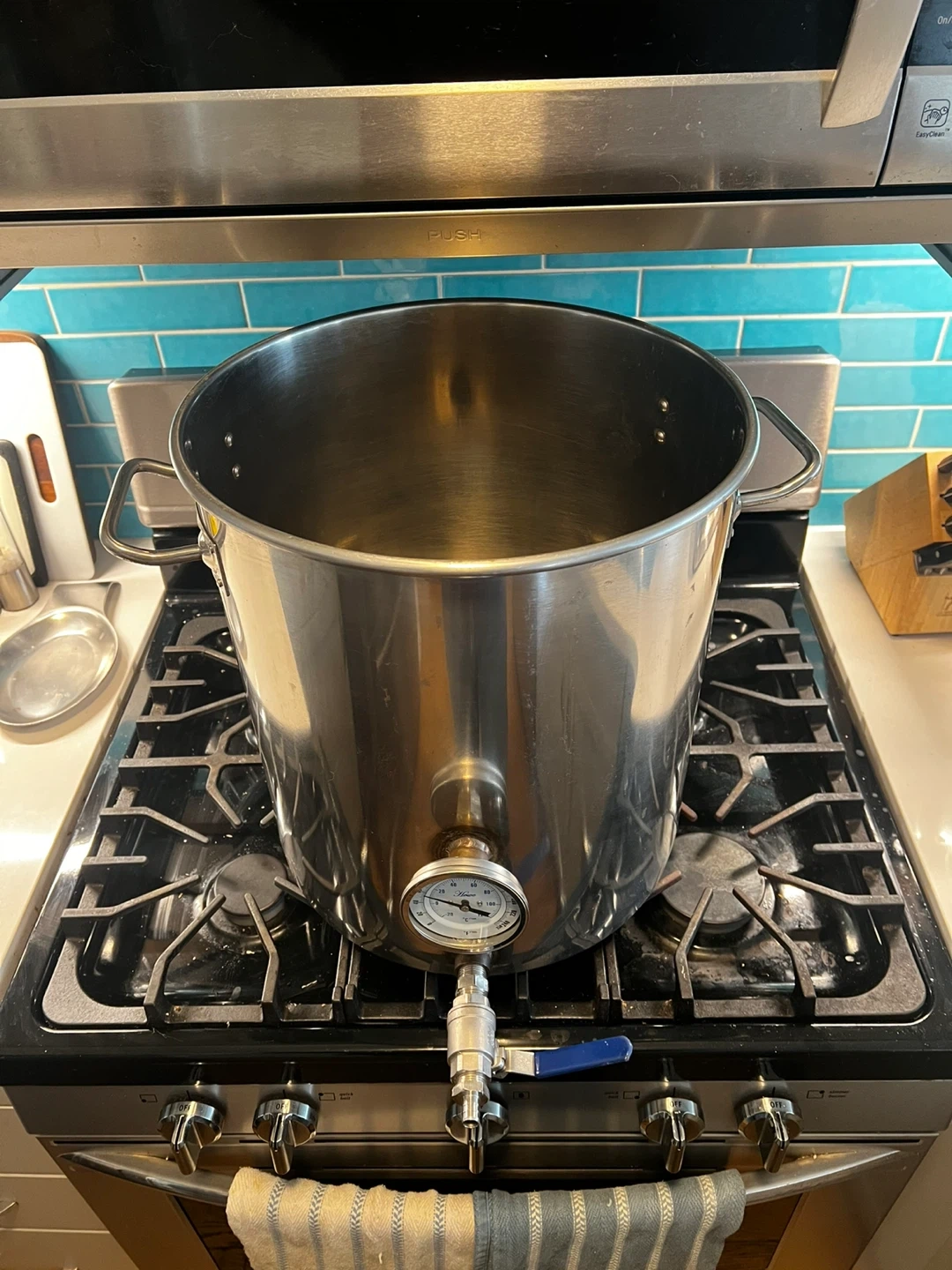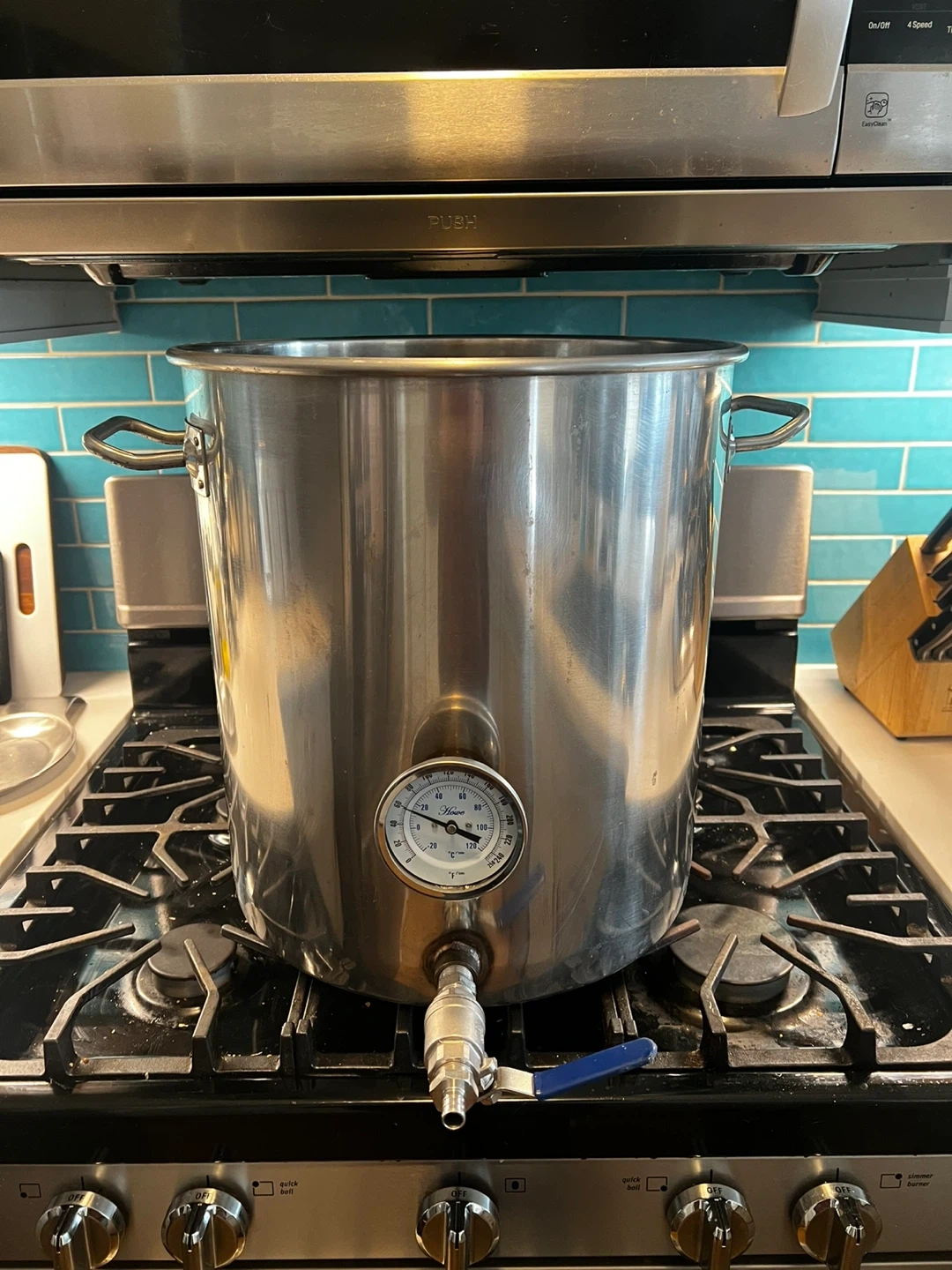 This 10 gallon stainless steel kettle is perfect for brewing or large-batch cooking. It features a built-in Howe thermometer and ball valve for transferring liquids. Stainless steel construction ensures durability and even heating. Excellent condition!