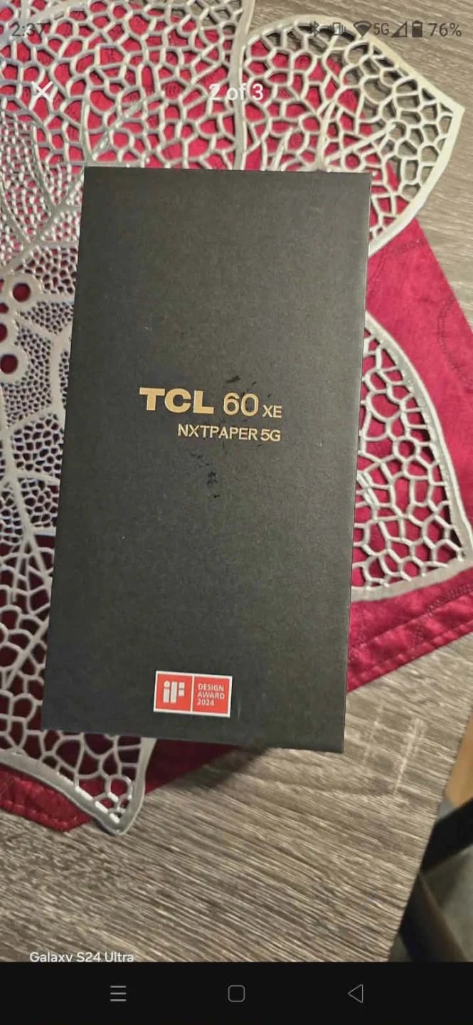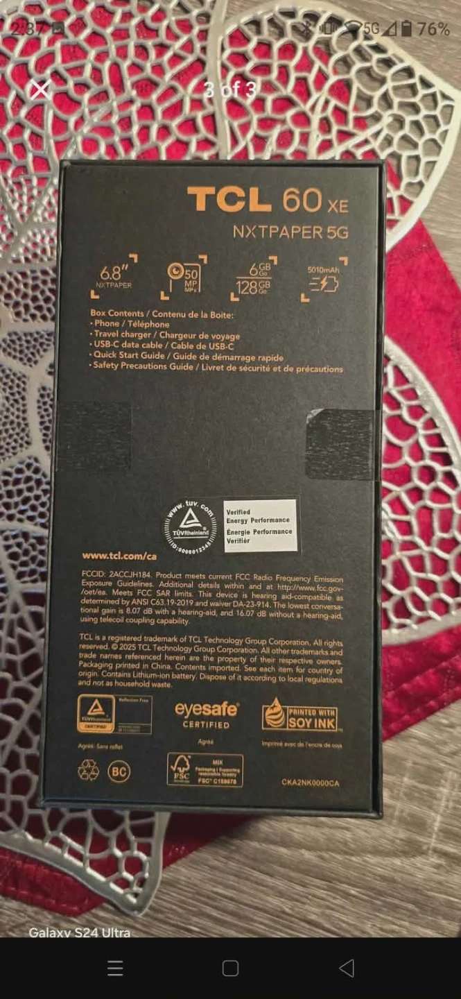 This is a TCL 60 XE Nxtpaper 5G smartphone in Space Blue. It has a 6.8" display, 6GB RAM, and 128GB storage. Box contents include the phone, charger, cable, and safety precautions guide. This device is designed for everyday use. $120 firm