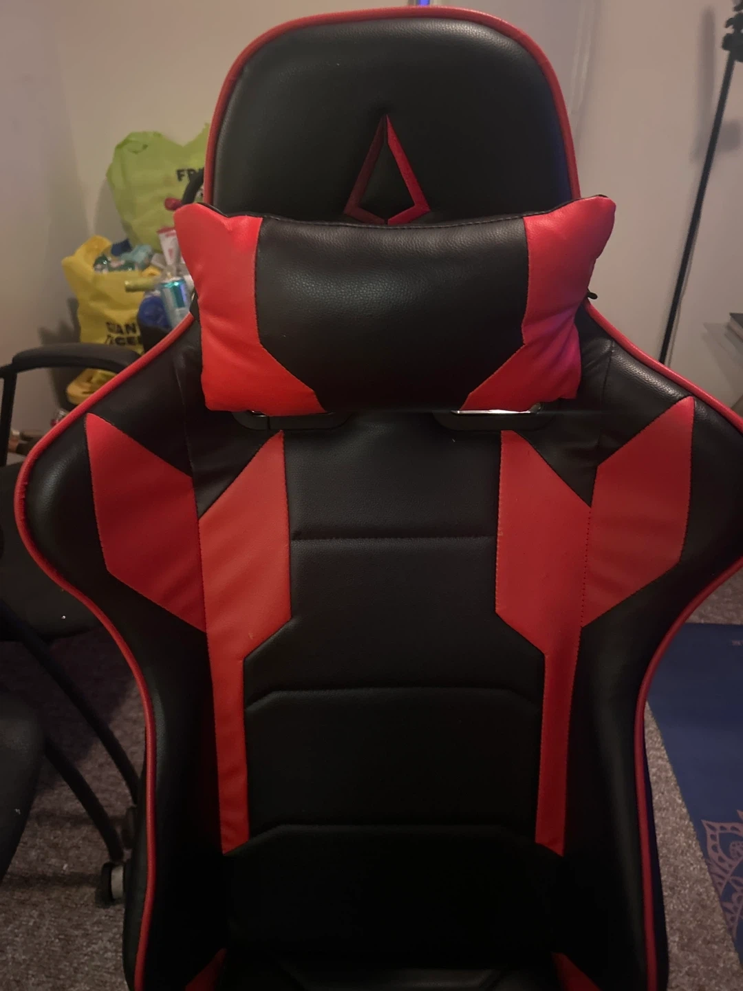 Selling a gaming chair in red and black. It has some of wear, as shown in the pictures. Great for long gaming sessions!