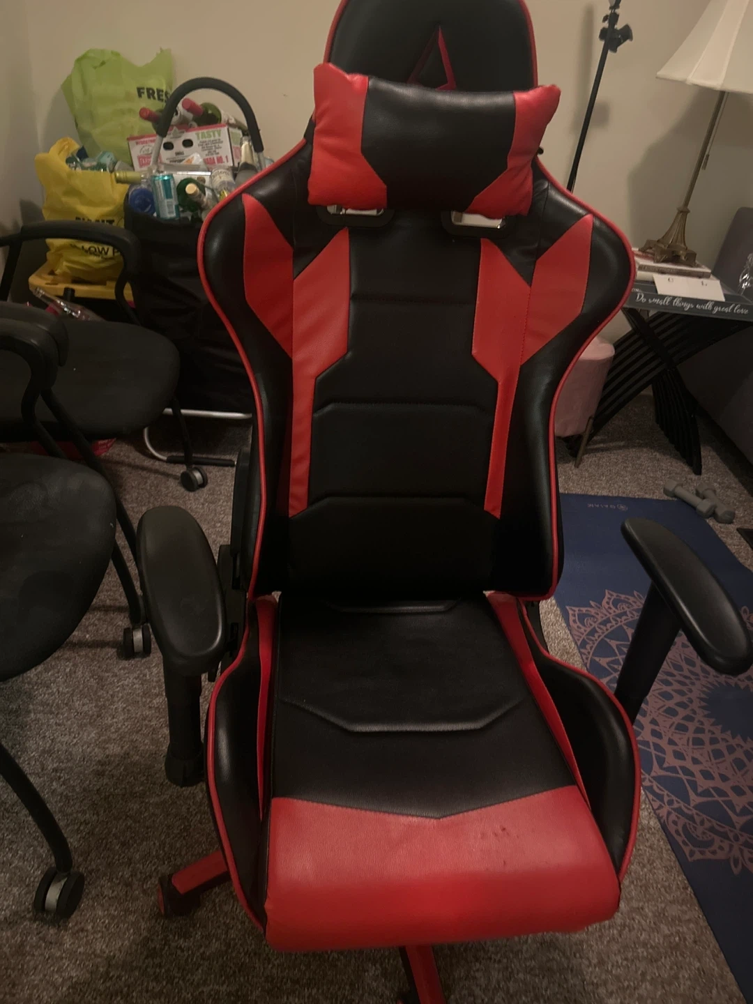 Selling a gaming chair in red and black. It has some of wear, as shown in the pictures. Great for long gaming sessions!