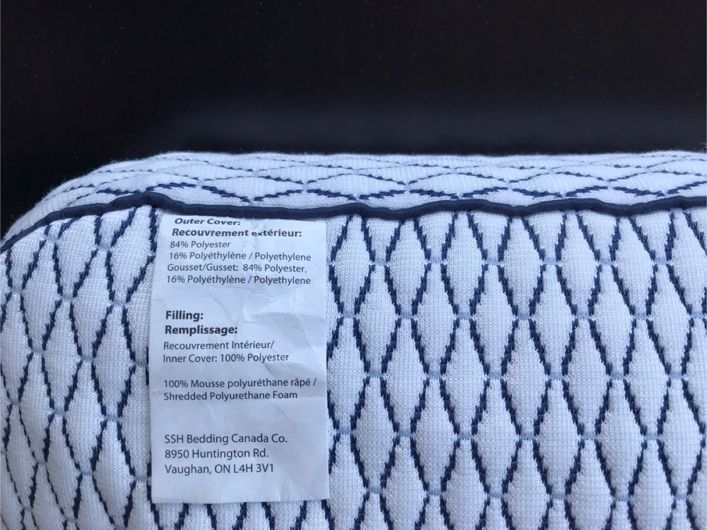This Serta Comfort pillow has an outer cover made of 84% polyester and 16% polyethylene. It's filled with 100% shredded polyurethane foam for support. The inner cover is also 100% polyester. $75 Pair or $45 each