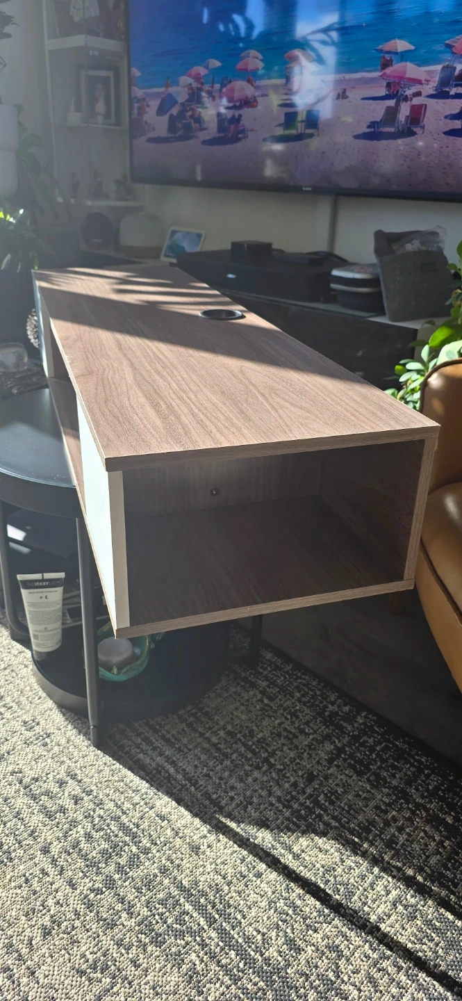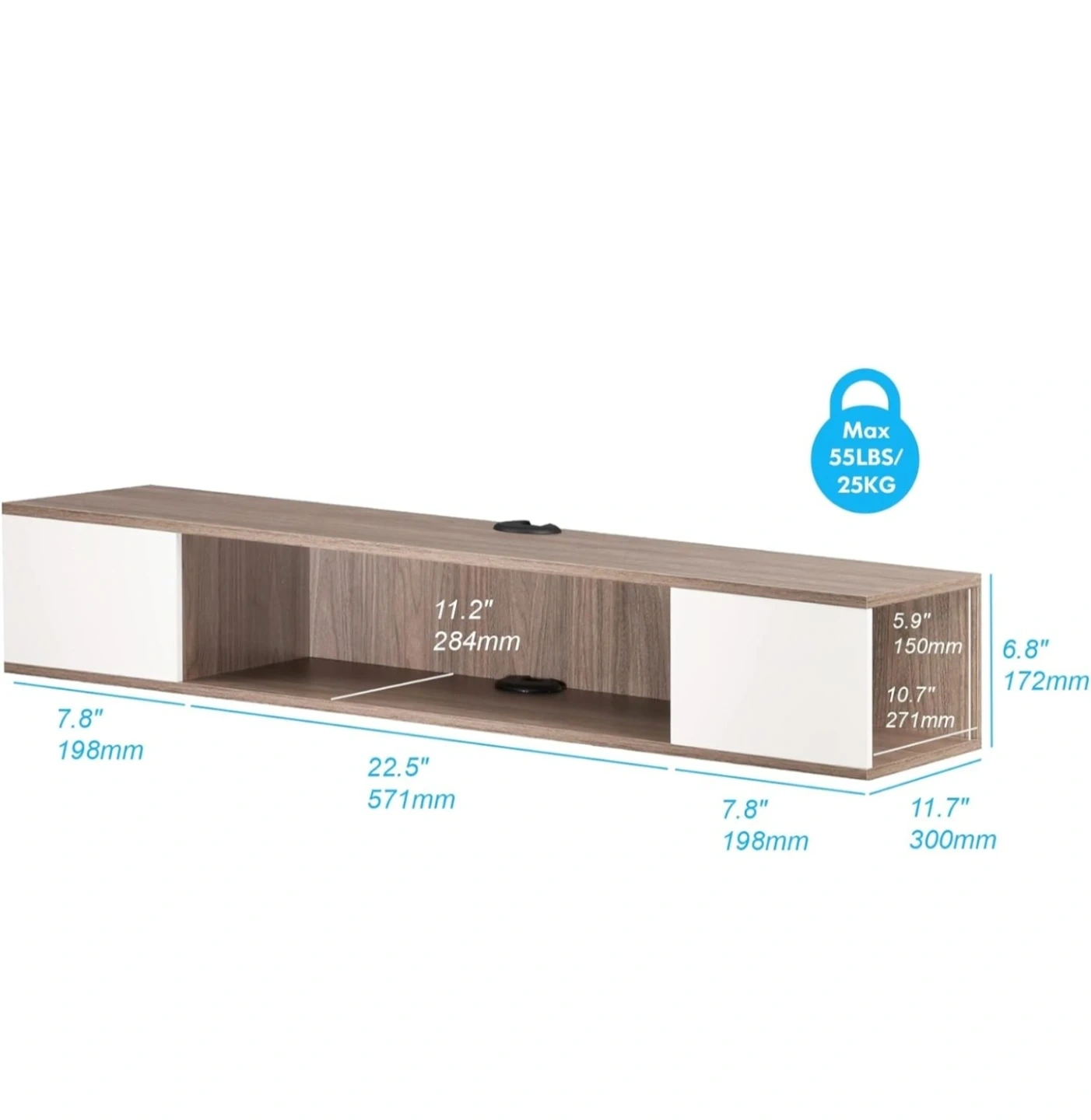 This is a stylish wall mount floating media console shelf with a wood grain finish and white accents. It offers two open compartments and two closed storage areas. Perfect for organizing your entertainment devices and accessories.