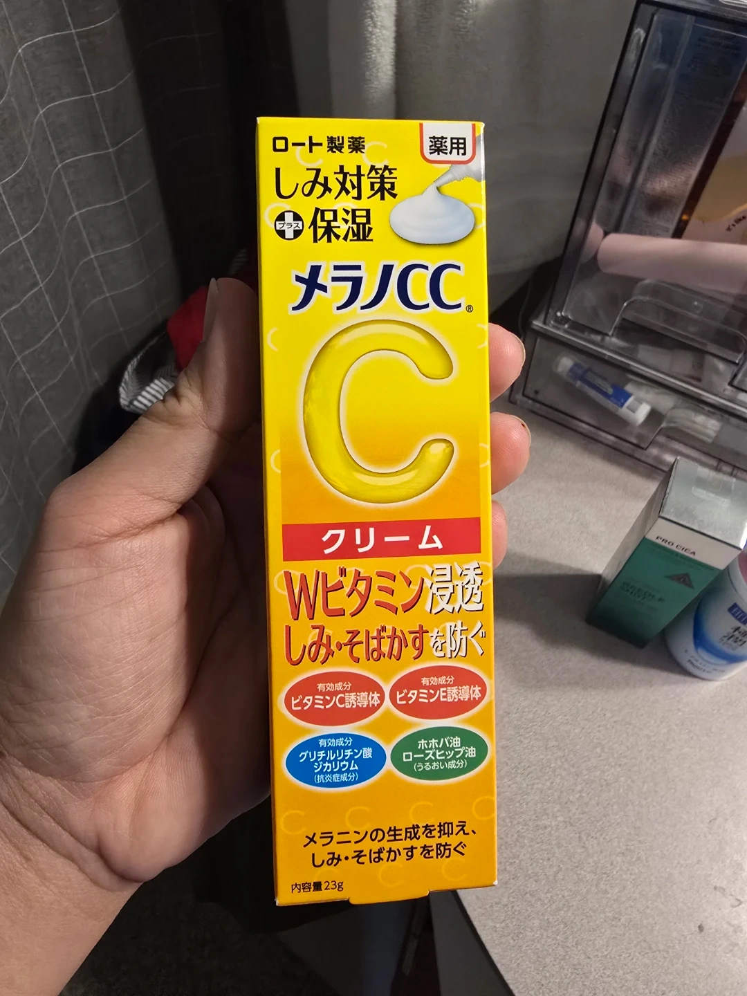 This is the Melano CC Brightening Cream, featuring W vitamin penetration. It's formulated to address dark spots and provide moisture. The cream contains active ingredients like Vitamin C derivative and Vitamin E derivative.
