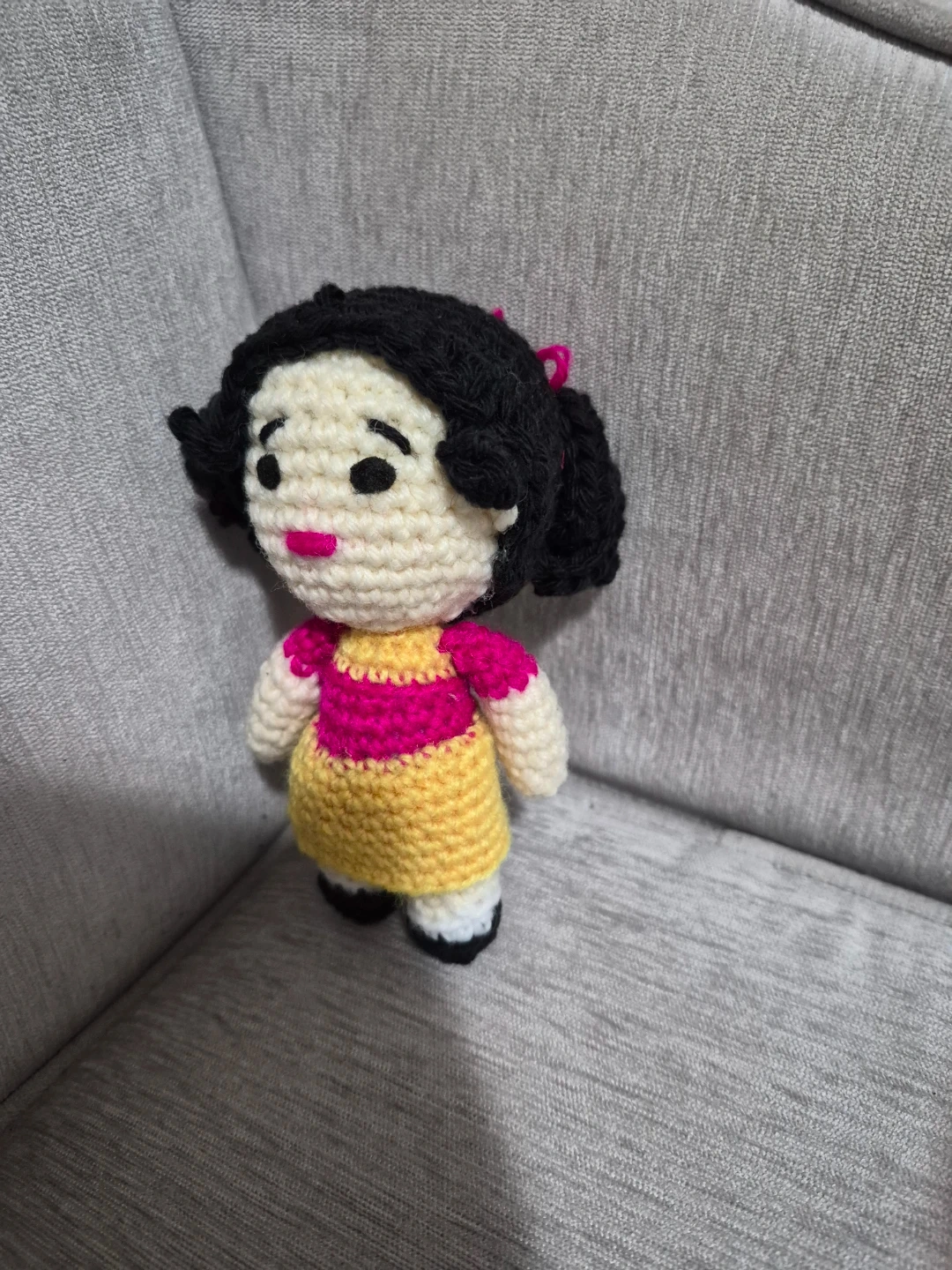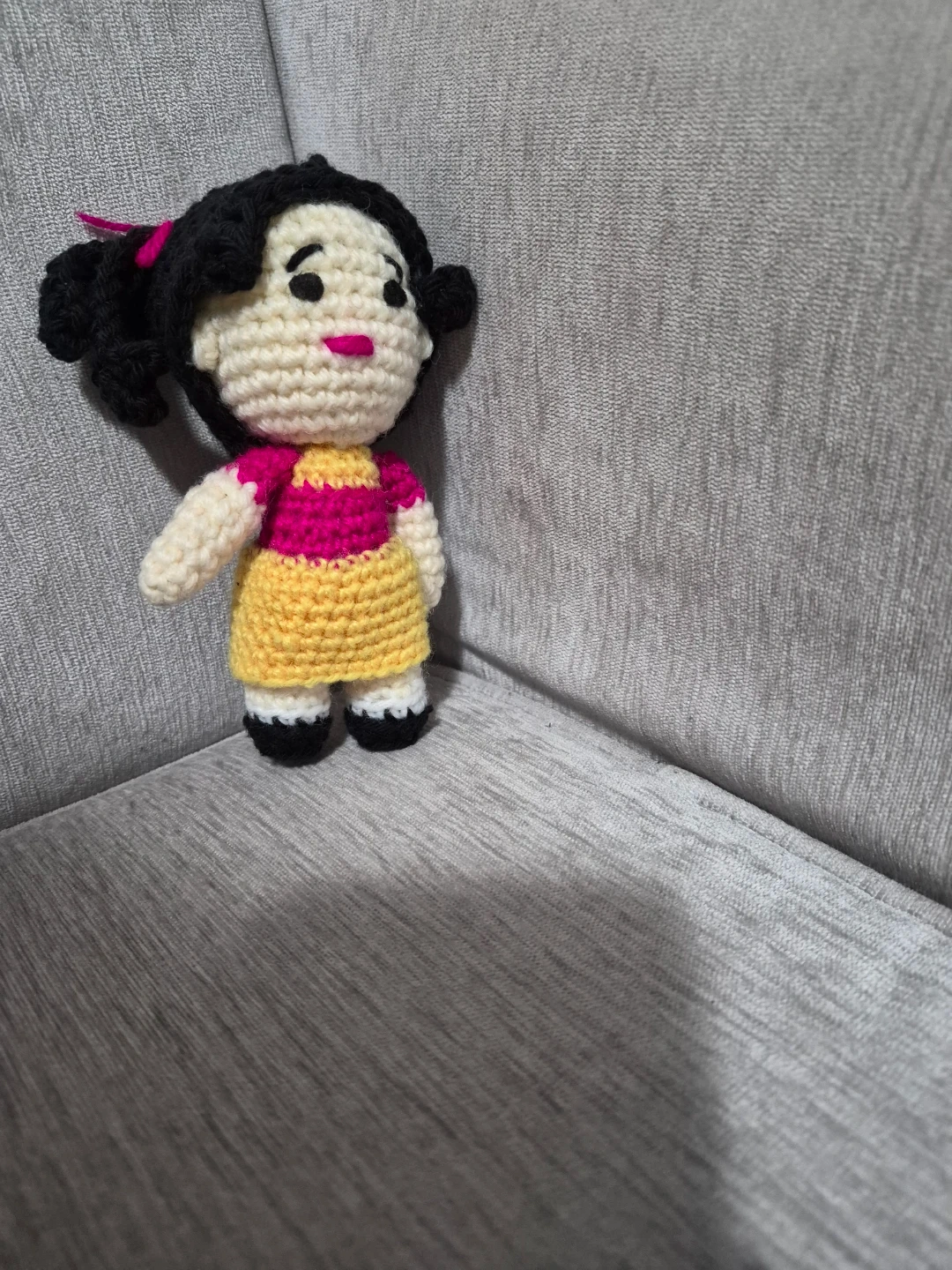 This is a cute handmade crochet doll. It's made of yarn and features black hair with a pink ribbon, a yellow skirt, and a pink and yellow top. Perfect for decorating a shelf or as a small toy!