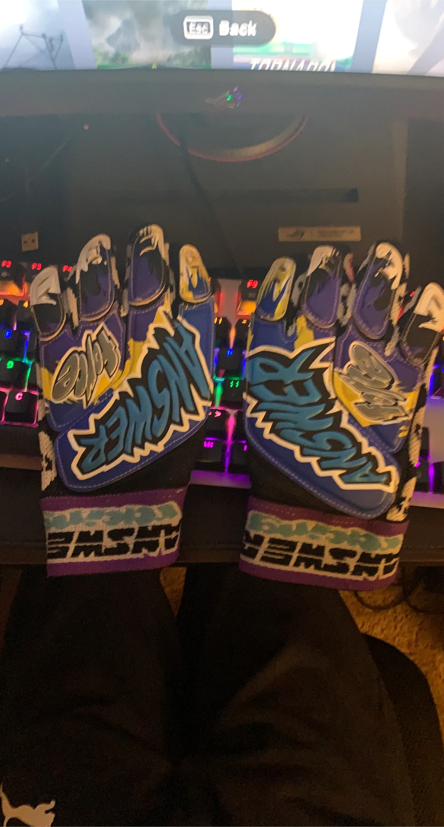 Answer Racing gloves in a striking blue, yellow, and purple design. These gloves are great for cycling or motocross. Constructed with durable materials for a comfortable fit.