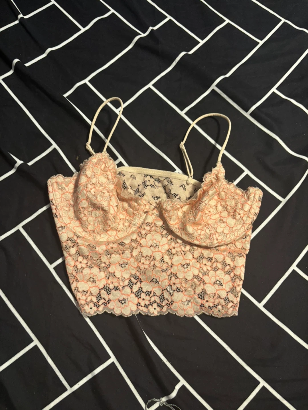 This is a peach-coloured crop top with an all-over floral lace pattern. It has adjustable spaghetti straps and a sheer, delicate look. It's made of a blend of nylon and spandex.