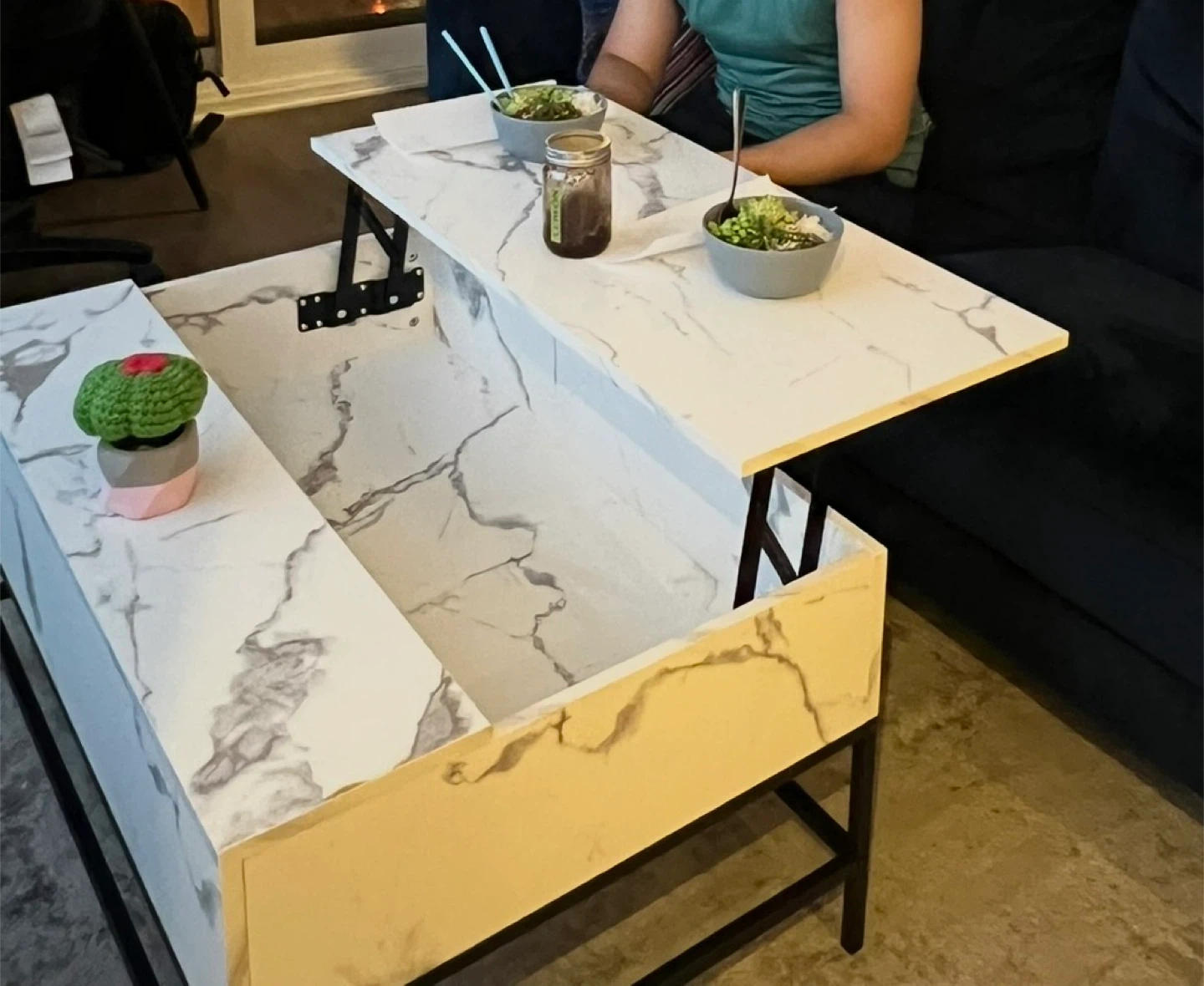 This lift-top coffee table offers a modern white marble look with a convenient lifting mechanism. It's great for enjoying meals or working from your couch. Plenty of storage space is hidden inside!