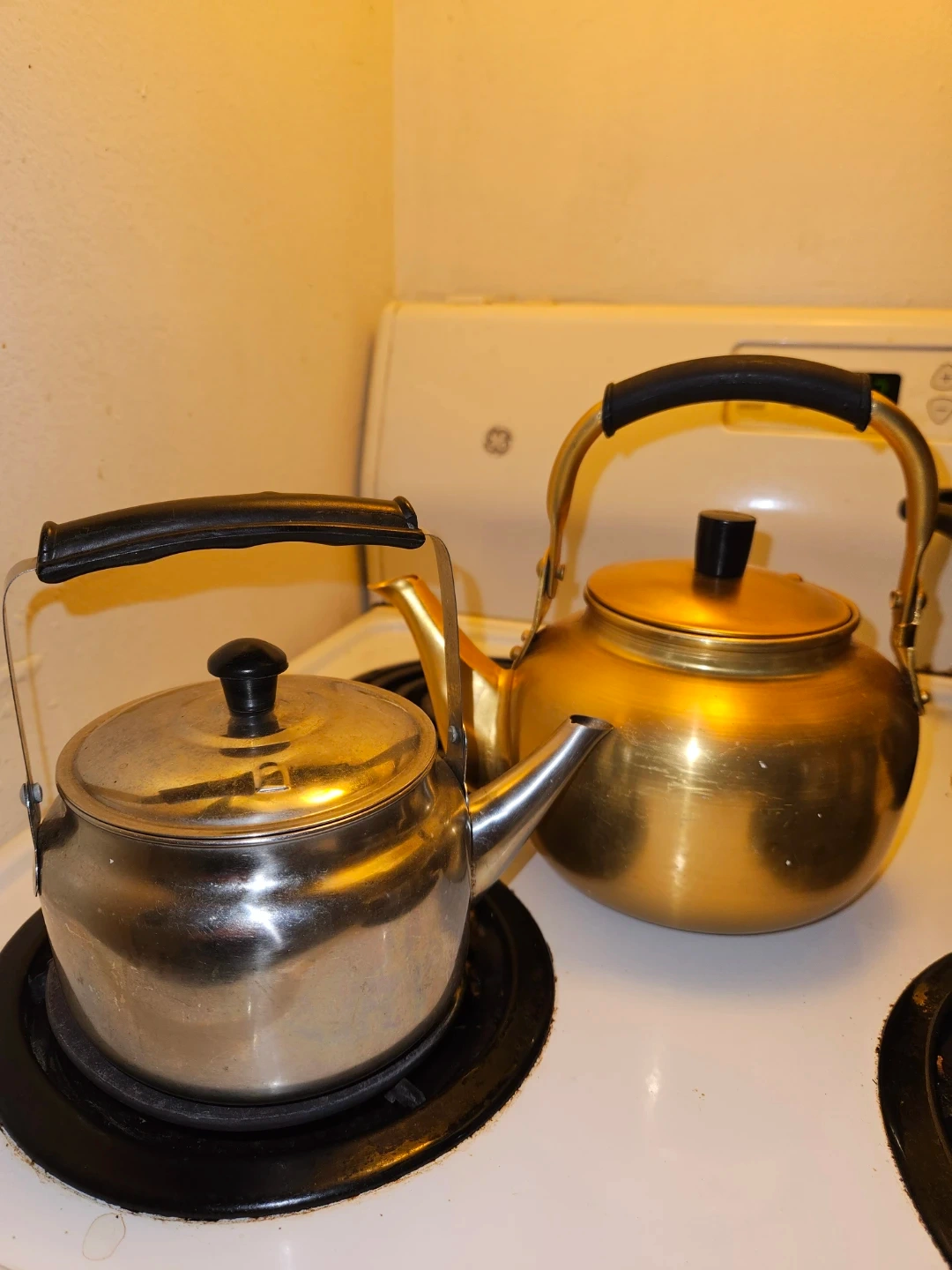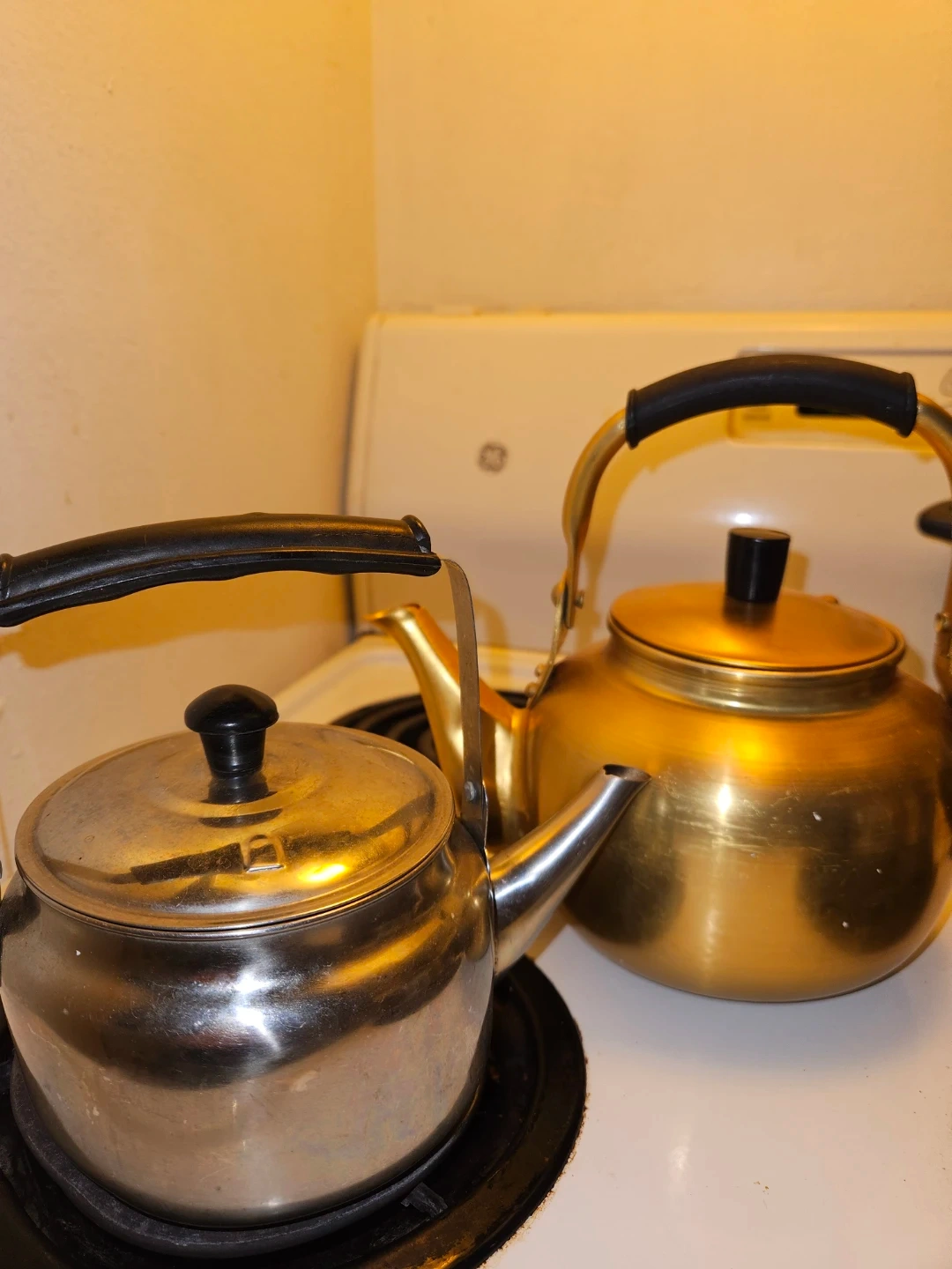 A stainless steel tea kettle and a brass tea kettle are up for grabs. Both have sturdy handles and spouts for easy pouring. They're ready to boil water for your favourite hot beverages!