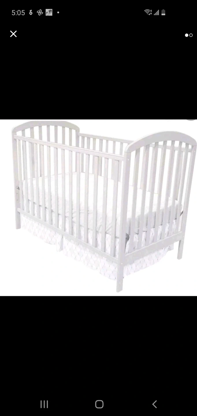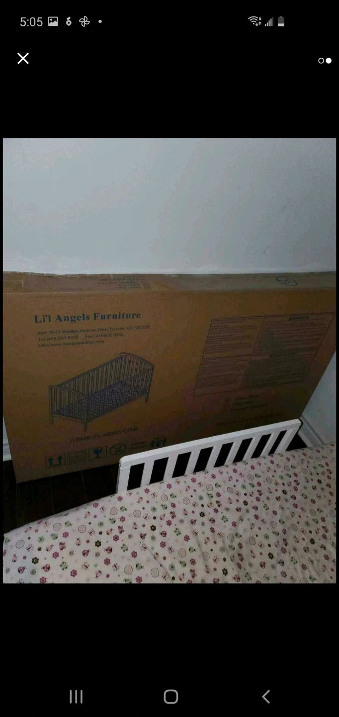 This is a crib from Lil' Angels Furniture. It's a white wooden crib with a mattress and crib skirt. The crib has a classic design with slatted sides.