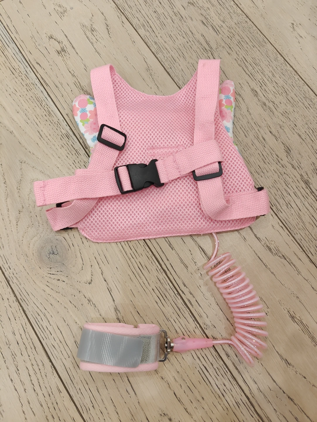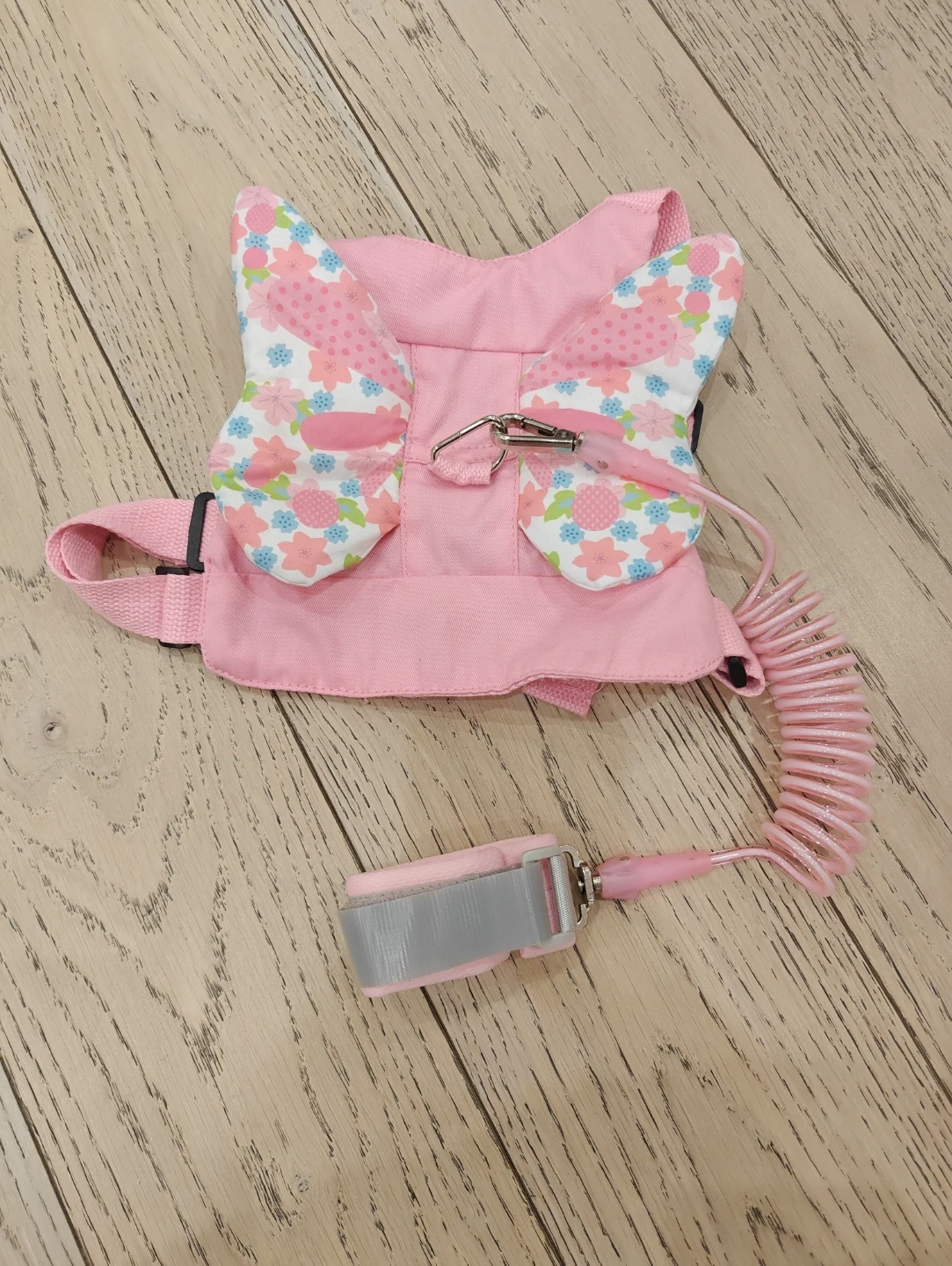 This pink toddler harness features cute butterfly wings for added style. It includes a comfortable wrist strap and a coiled leash for safety. The adjustable straps ensure a snug fit for your little one.