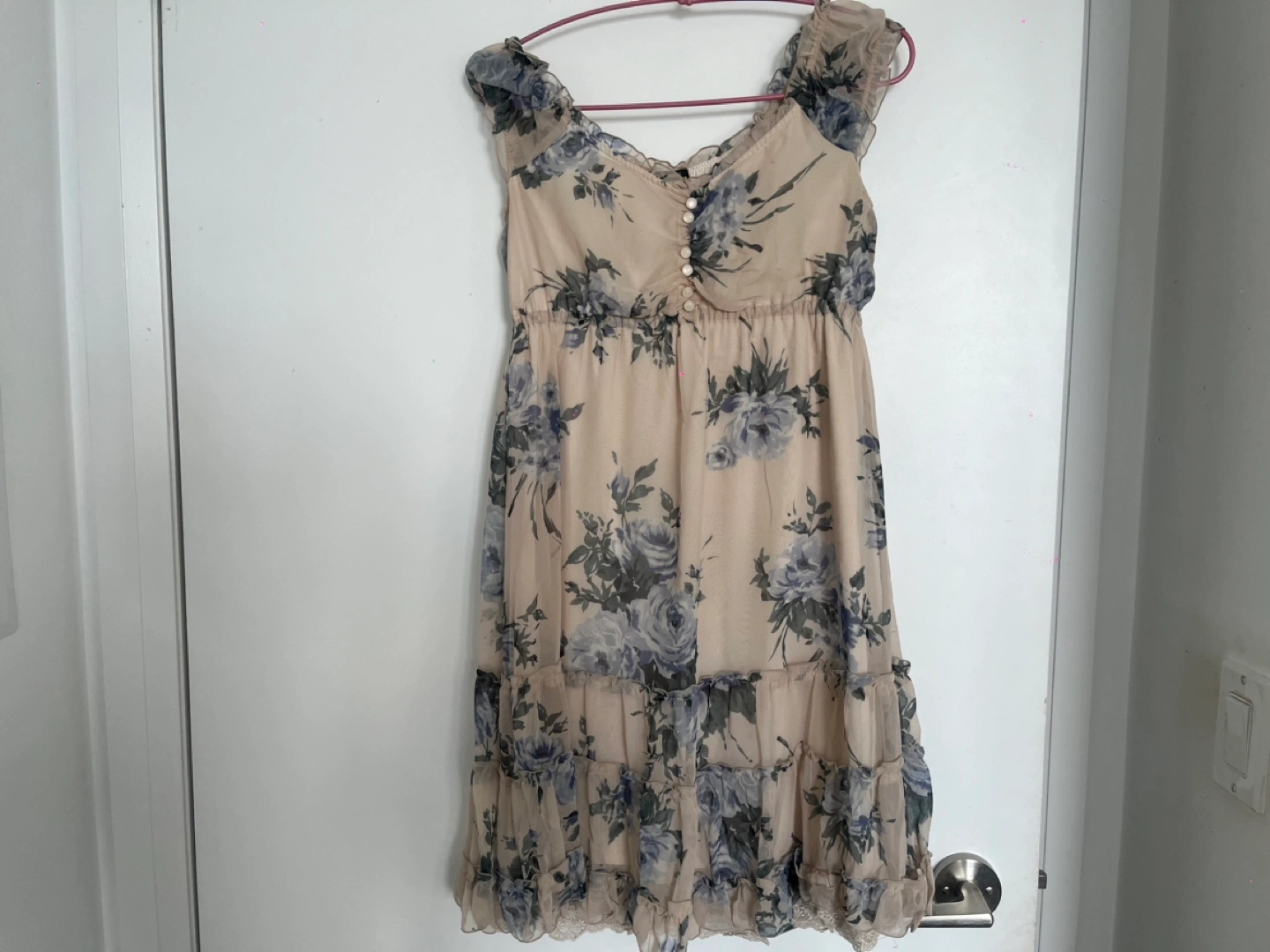 Beige sleeveless dress with blue floral print. Ruffled neckline and hem. Button closure at the front.