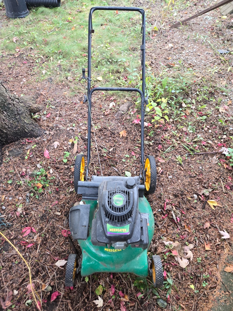 Buy & SellWeed Eater 2T Lawn MowerWeed Eater 2T Lawn MowerFreeGas-powered lawn mower with wheels. Green and black. Has a pull start. Need some repair. ConditionOkayWHERE TO MEETWoodbine and DonvaleView MapSELLERGeorgeAurora SE210 reviews0 chats·0 favorites·19 views