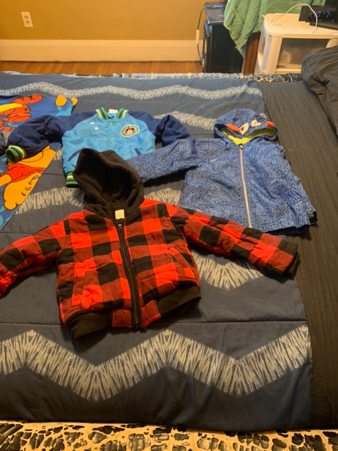 Five kids jackets. All size 3T. Two are fleece lined, one is a rain jacket, and two are lightweight. $20 EACH. Plaid jacket is sold.