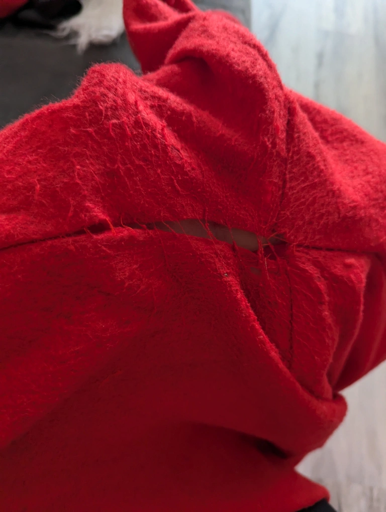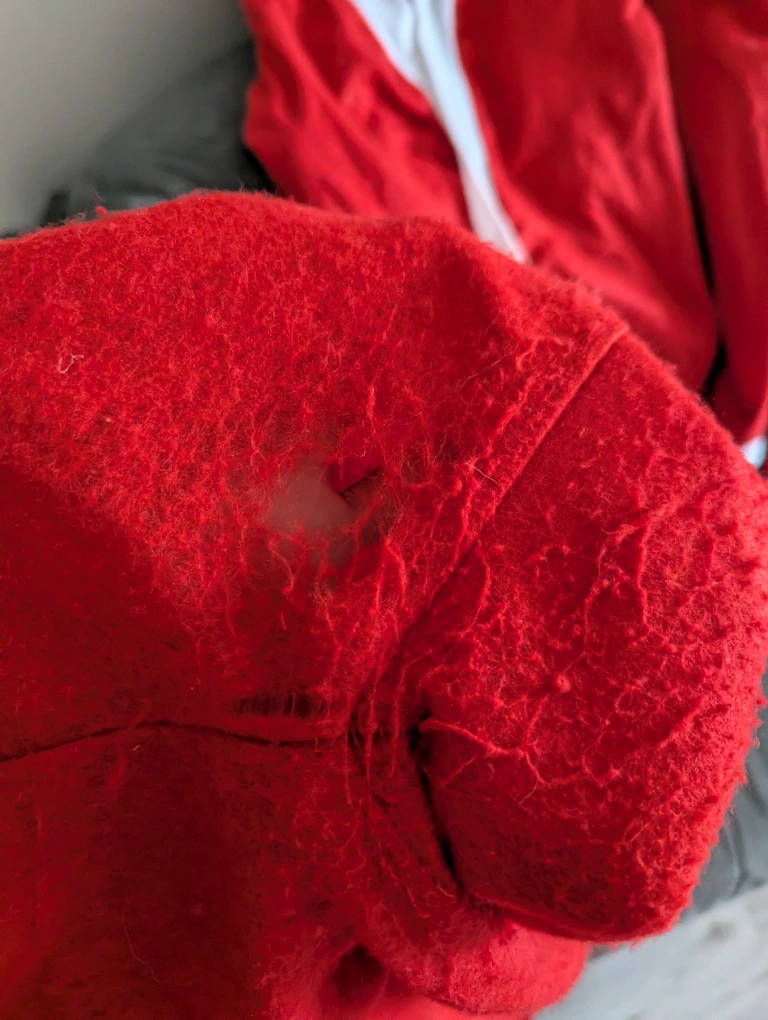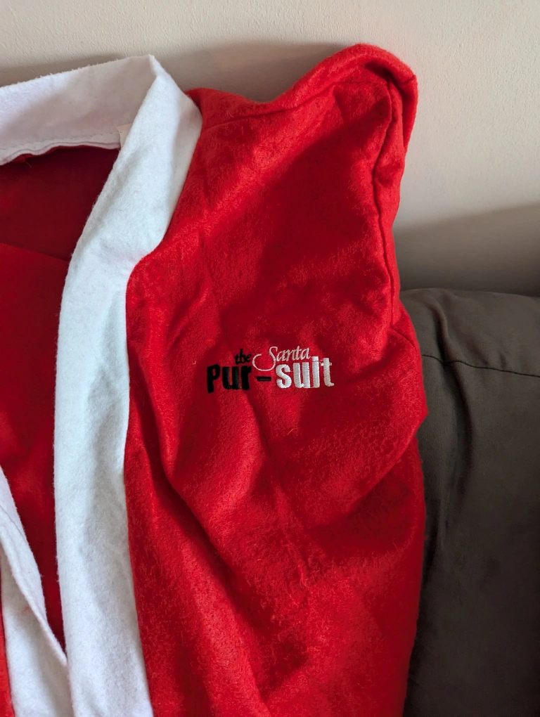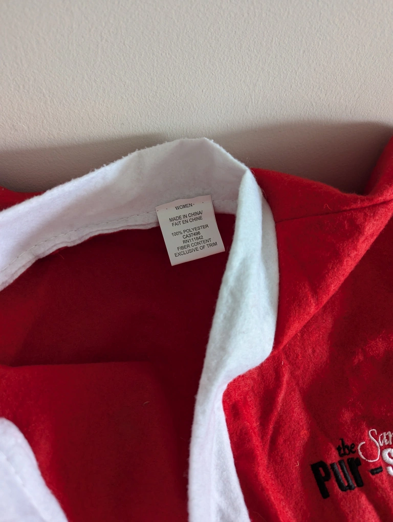 Santa suit with a jacket, pants, and hat. Red with white trim. 2 suits