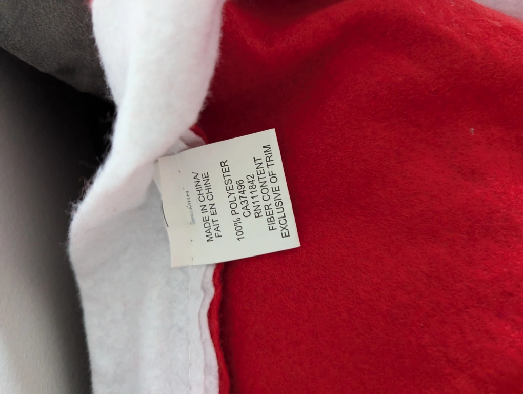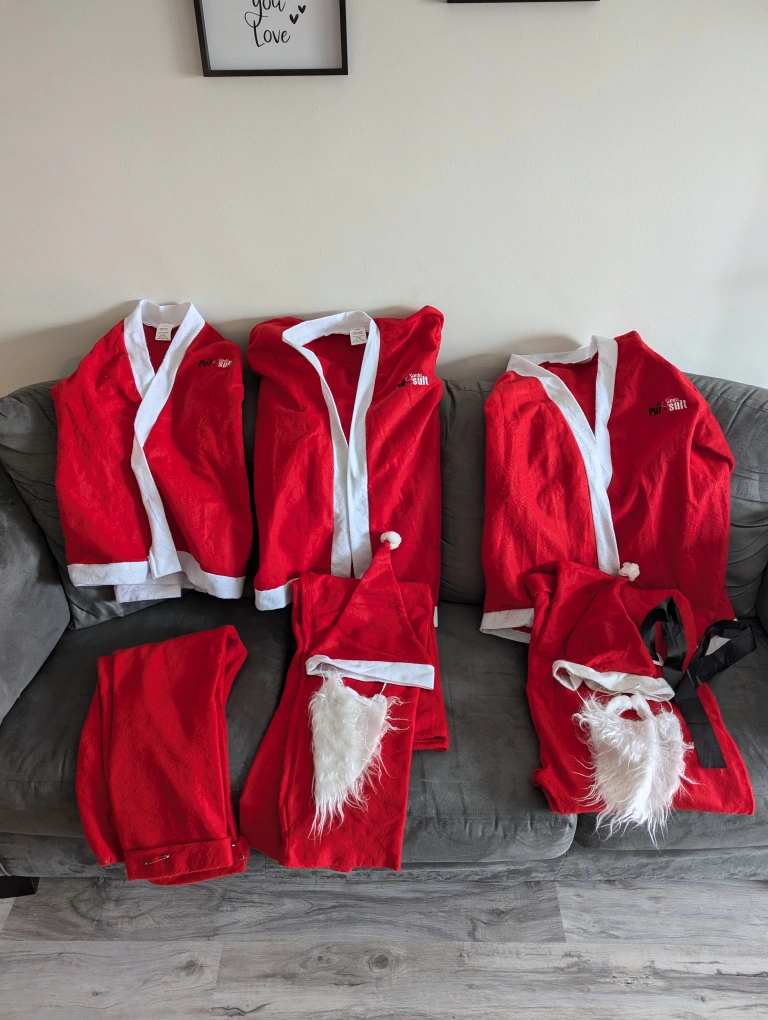 Santa suit with a jacket, pants, and hat. Red with white trim. 2 suits