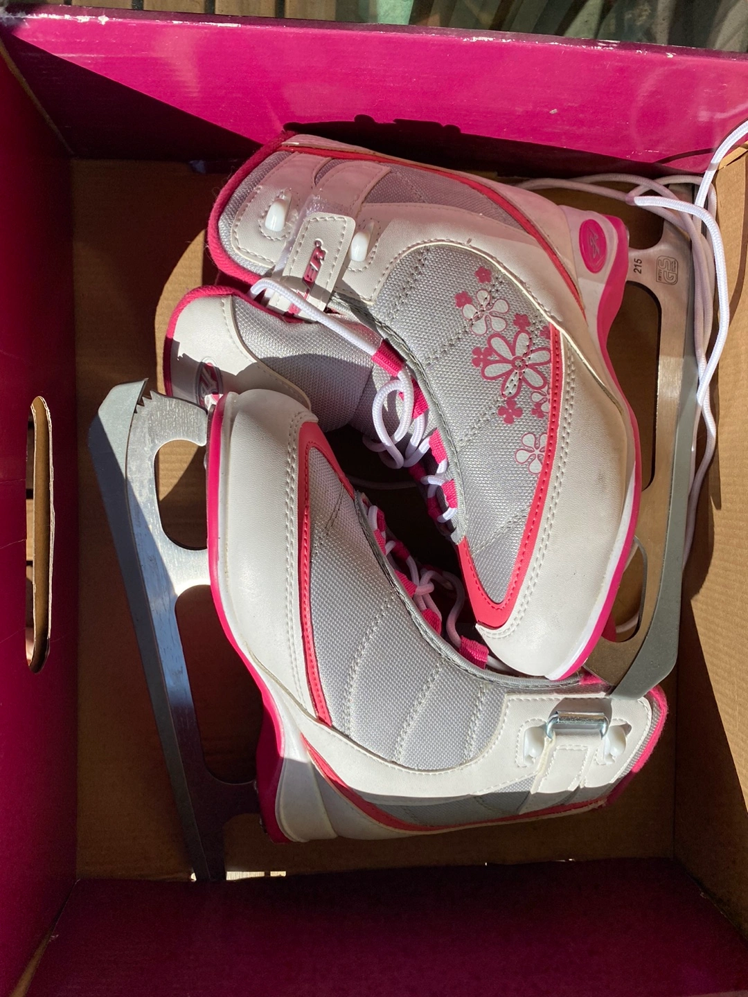 435White and pink figure skates. Lace up style with flower design. Includes original box. These may have been used once or not used at all. Perfect condition Like New with box