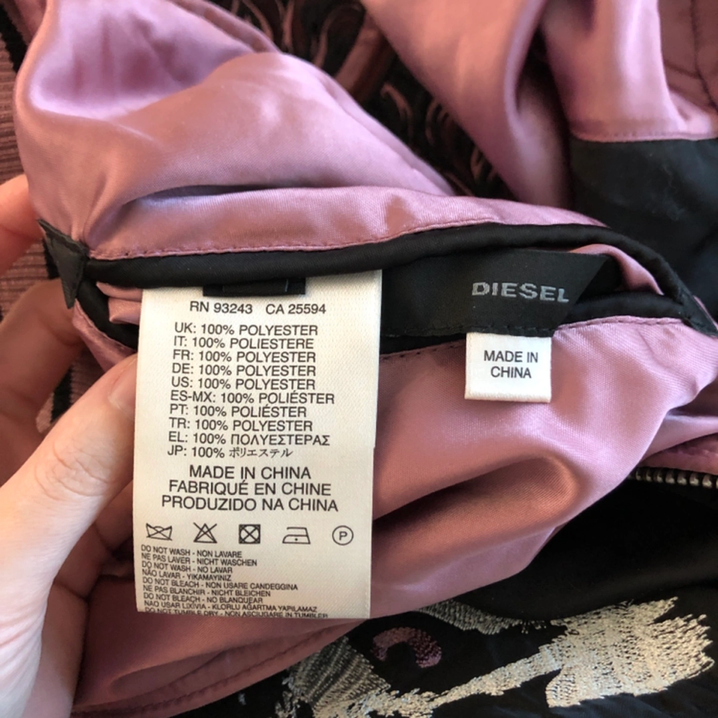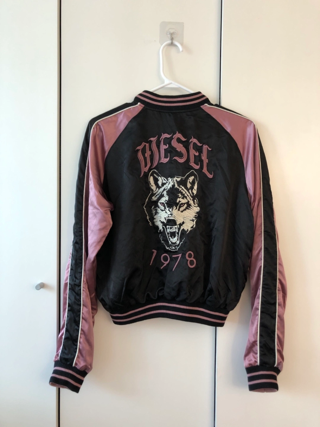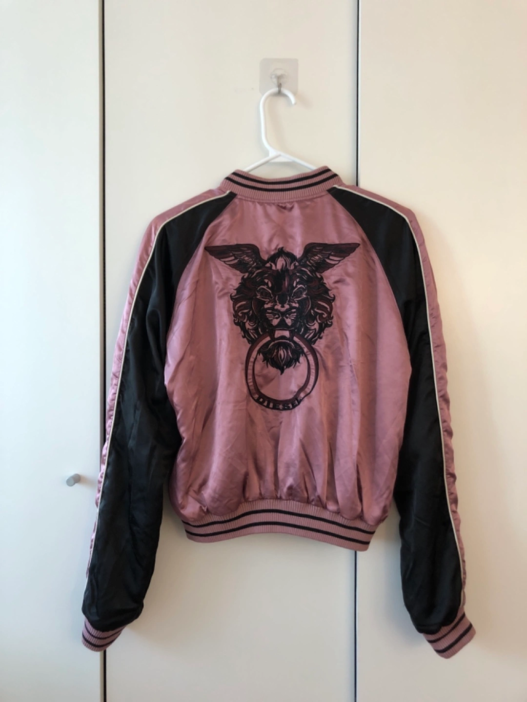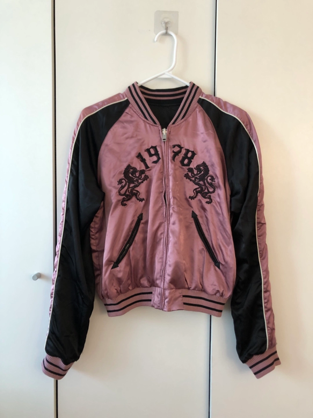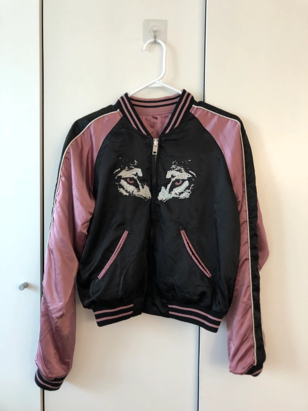 Reversible bomber jacket with a black and a pink side. Features a wolf, lion, and eye embroidery.