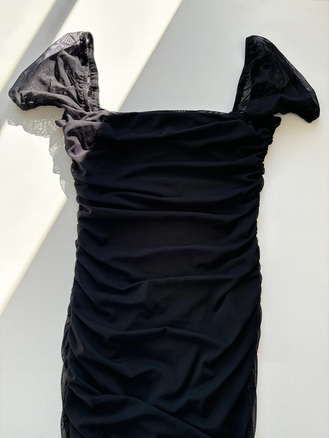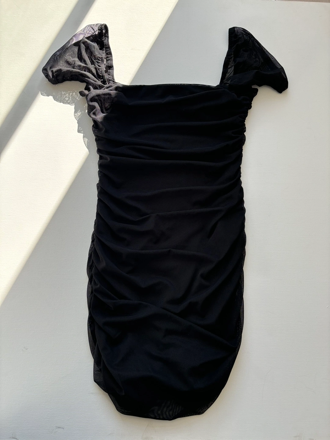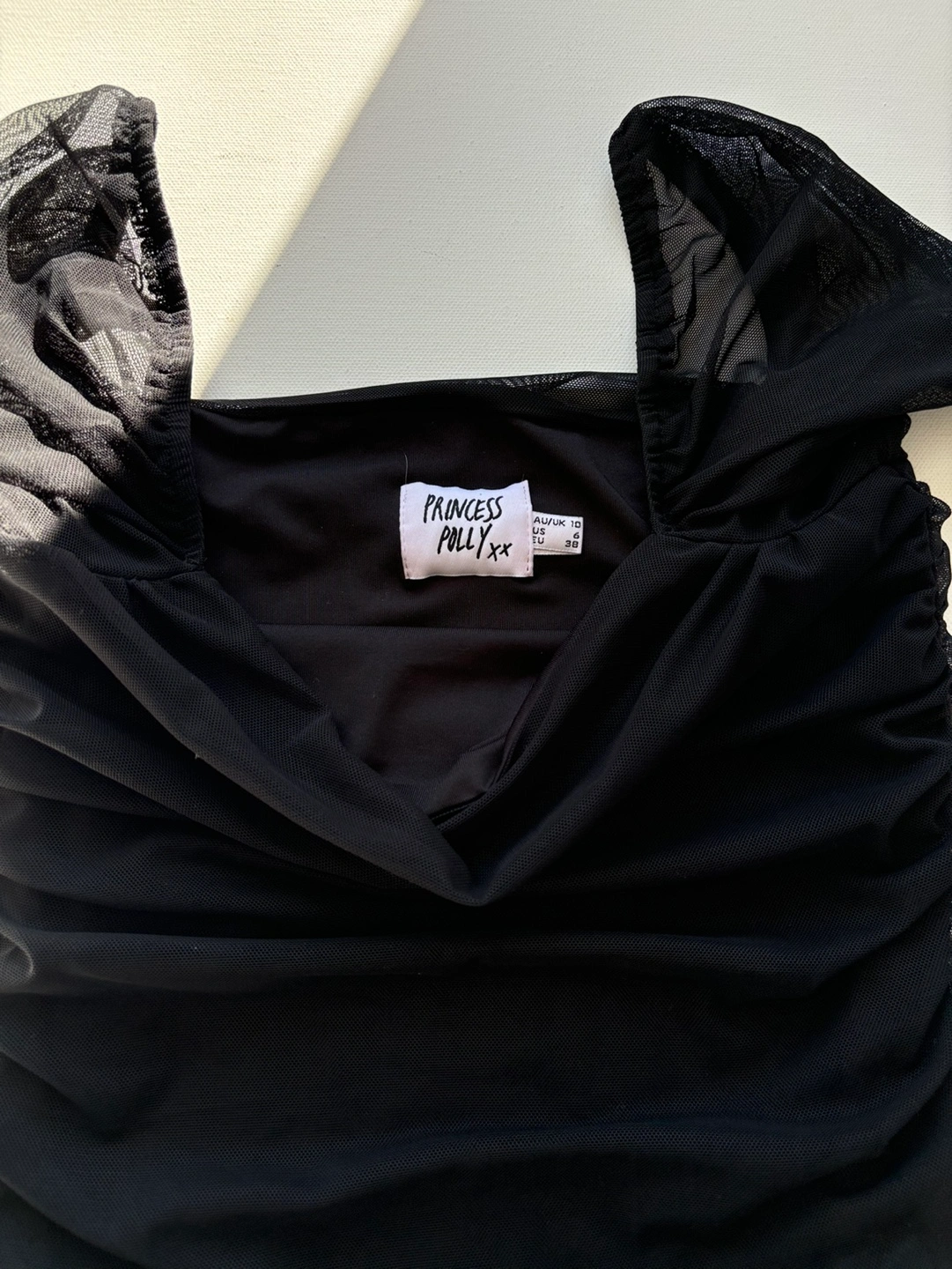 Size US 6 Can be worn on or off shoulder Pinched ruching down sides Good stretch Fully lined Slim fitting