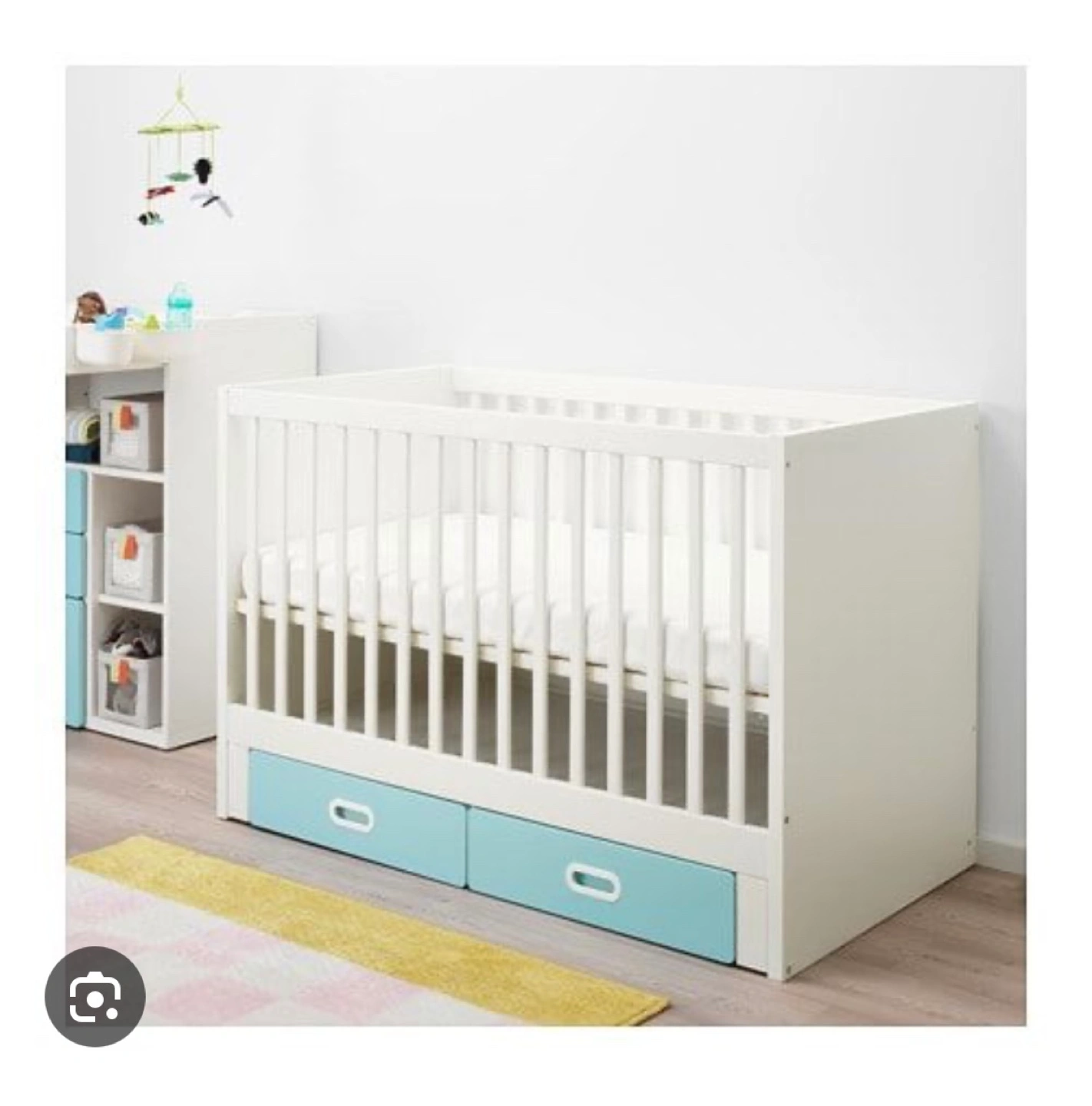 White crib with blue drawers. Convertible to toddler bed. Does not Include mattress.