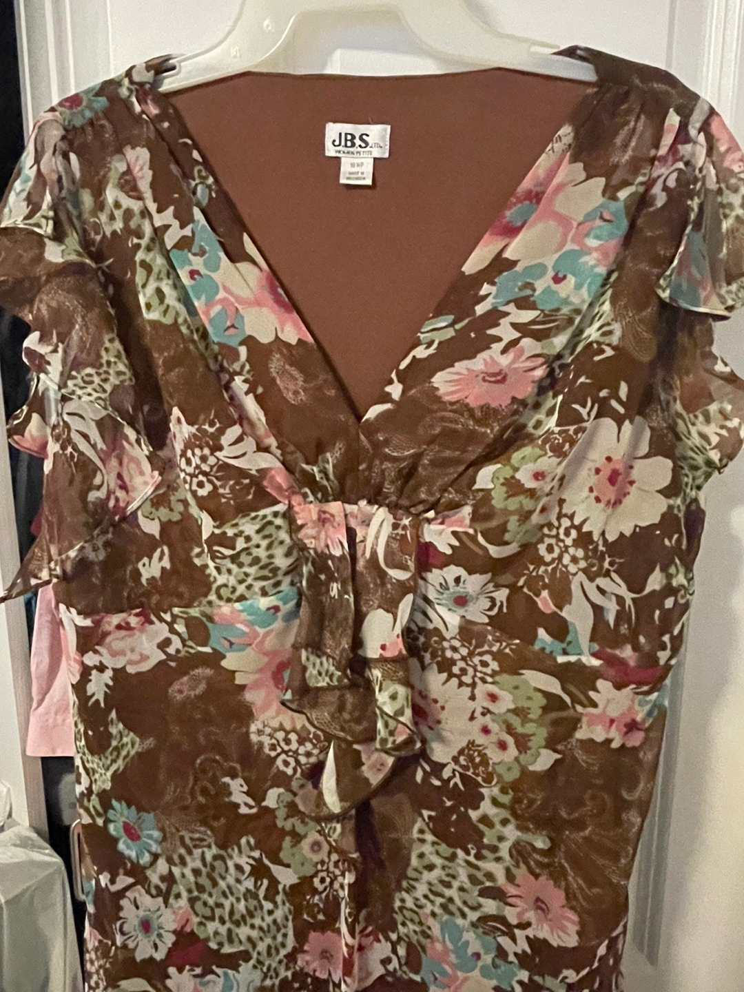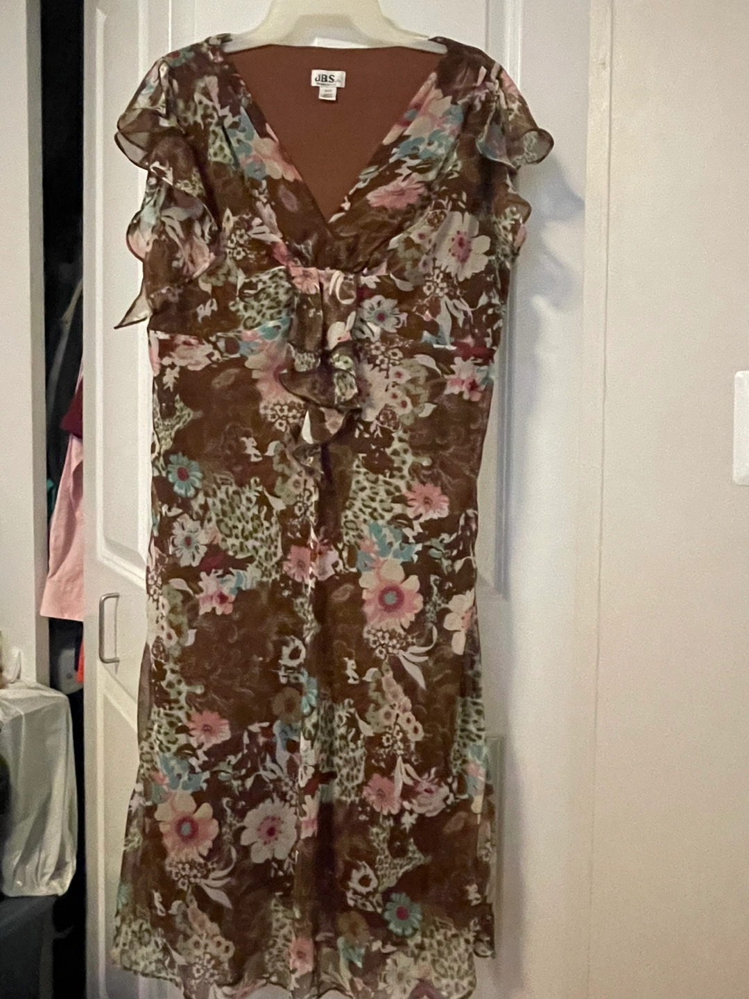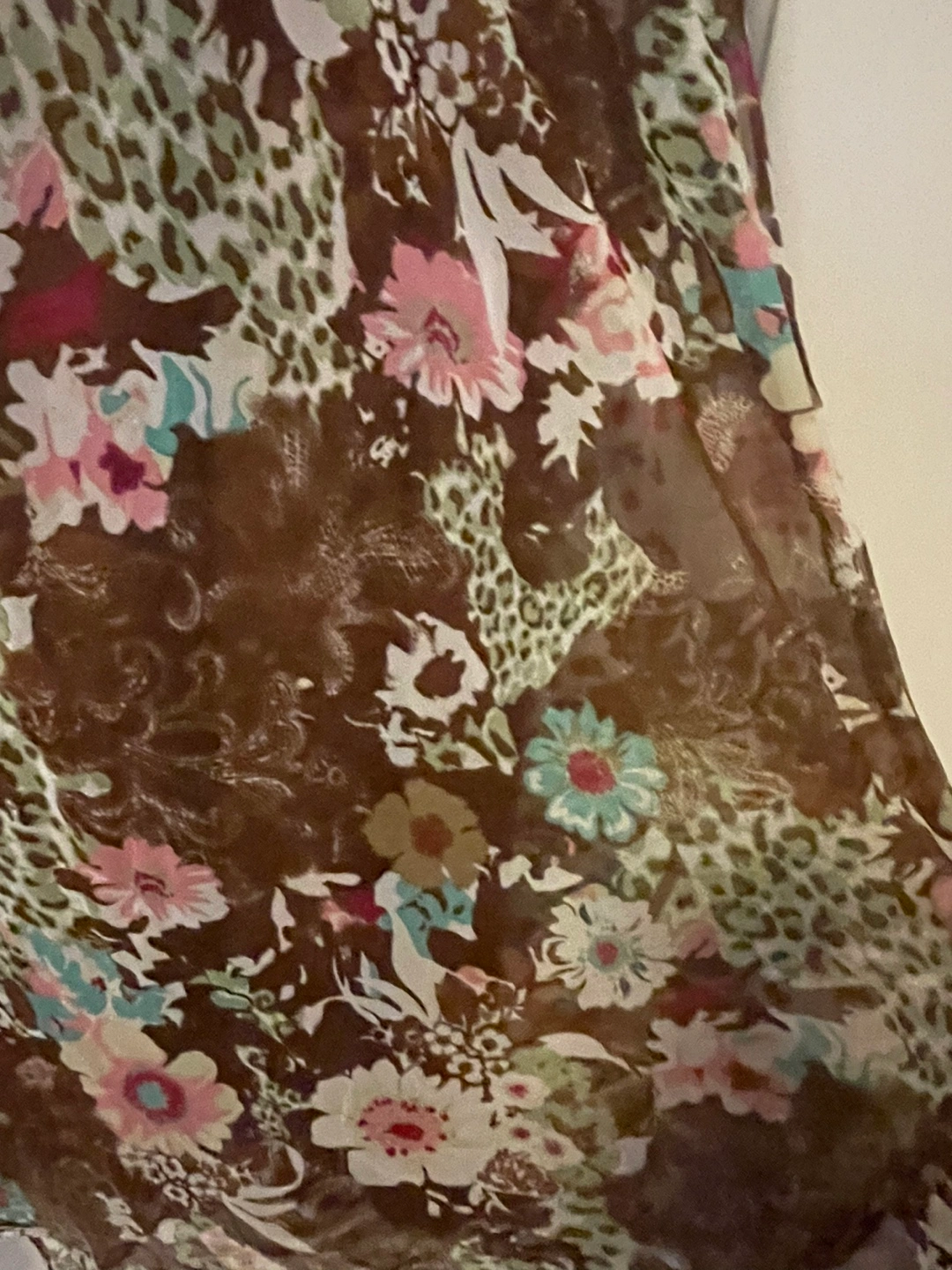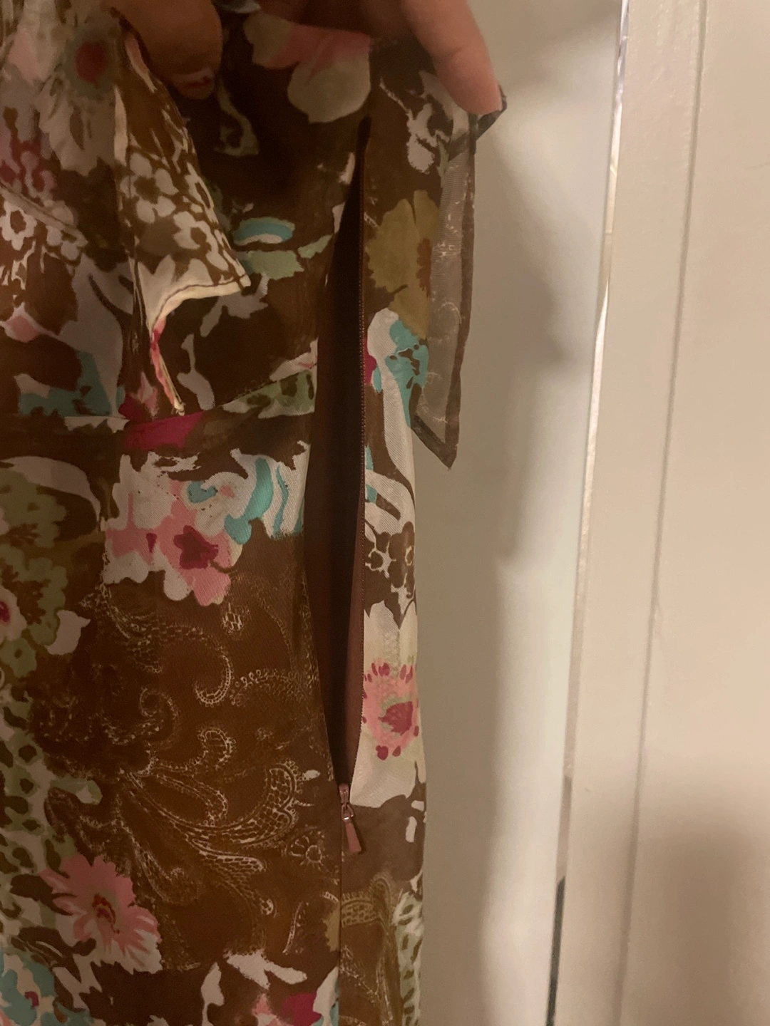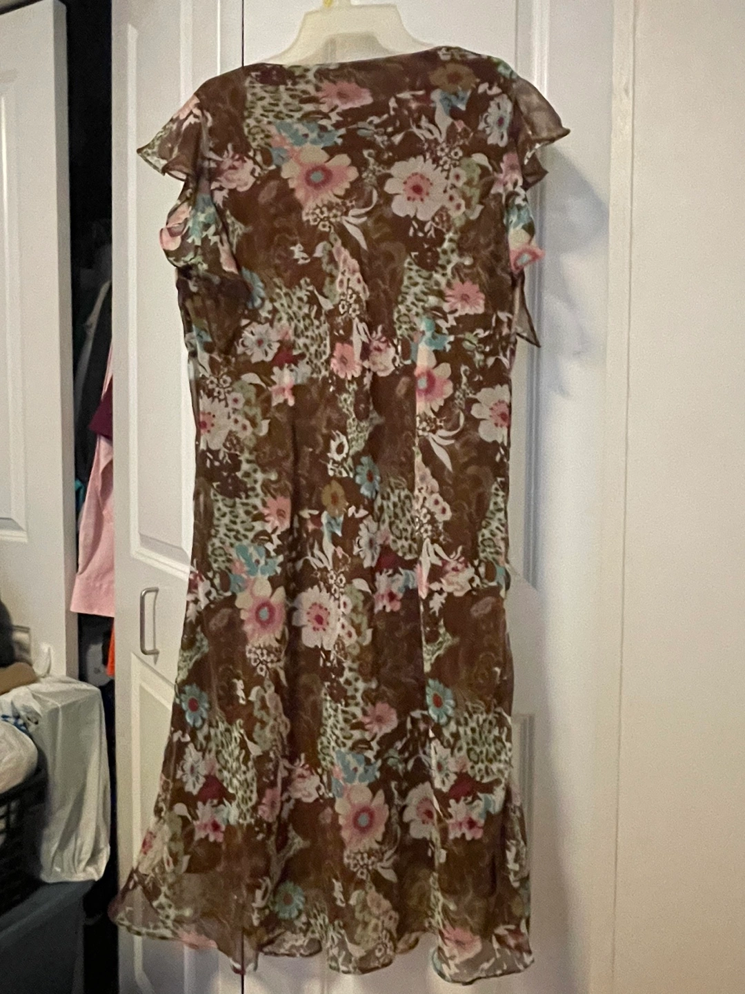 84Floral print dress. V-neck, short sleeves with ruffles. Zipper closure in the back. Made of a light, chiffon-like fabric.